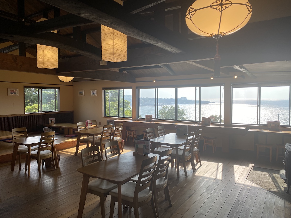 店内に入ると、まず目に入るのが絶景。相川の街並みと日本海の眺望を見ることができます。また天井が高いので、思わず長居したくなるような開放的な造りになっています。※外にはテラス席もあります。