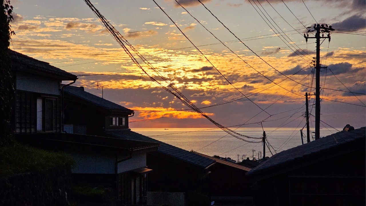 相川観光案内所でレンタサイクルを借りたら、目指すは京町通り!京町通りまでは10分ほどで到着します。この場所は、金山が栄えた江戸時代初期の繁華街で、佐渡奉行所と金山を結ぶメインストリートです。当時は、全国各地から移り住んだ鉱山関係者の住居や多くの商店が軒を連ね、なんと3階建ての家もあったそうです。そんな場所から見る夕陽はまさに一級品です。