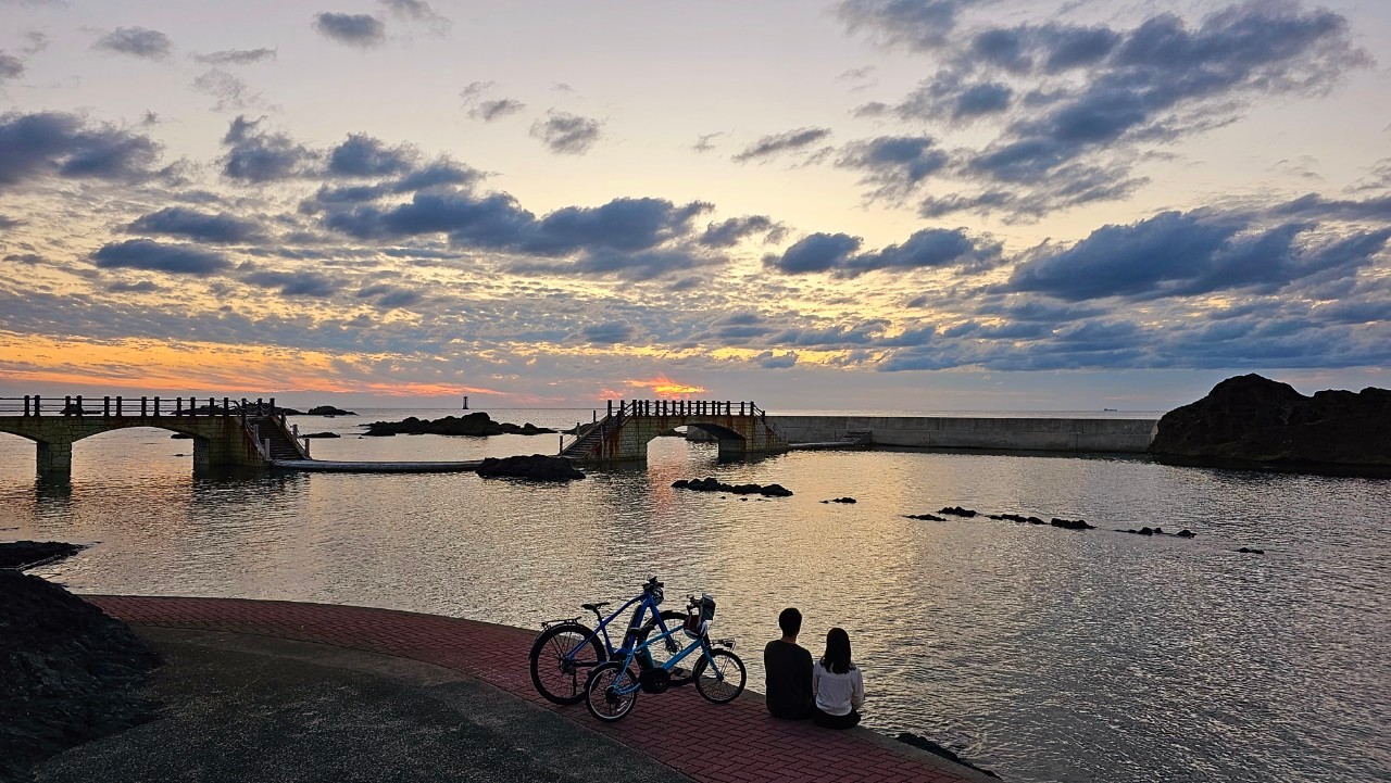 佐渡相川日本海展望台からは自転車で7分ほどで到着します。相川地区市街地の北端に位置し、景勝地としても有名です。また、某有名アイドルグループのMVの撮影地としても使われました。堤防に向かっていく海の上には橋がかかっており、自然が織りなす風景美と合わさると、とても情緒を感じられます。