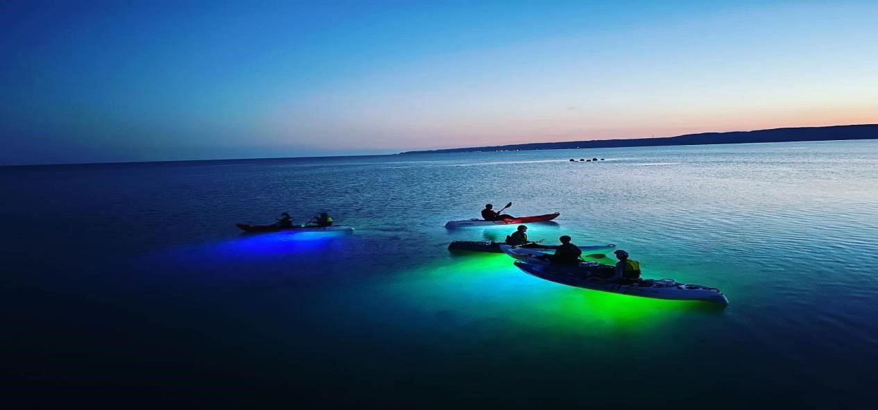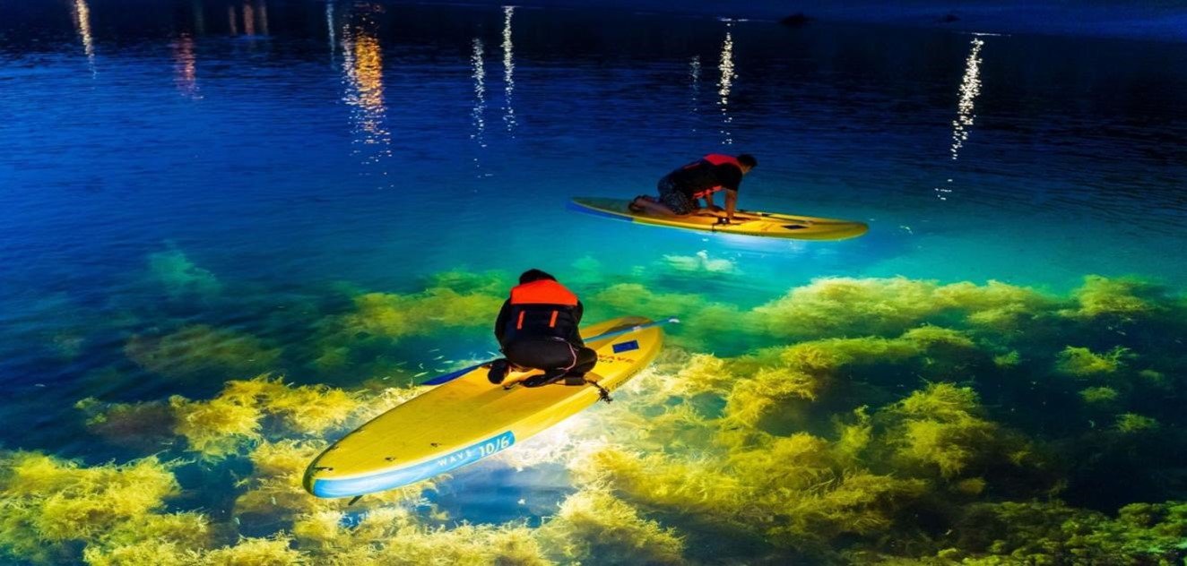 水质清澈透明,是探索岩岸、观察海洋生物和欣赏日落的完美场所。你甚至可以参加夜间海皮划艇体验,船底会发光!这种独特的体验让你能透过水晶般清澈的水面,观赏星光闪烁下的海底世界。