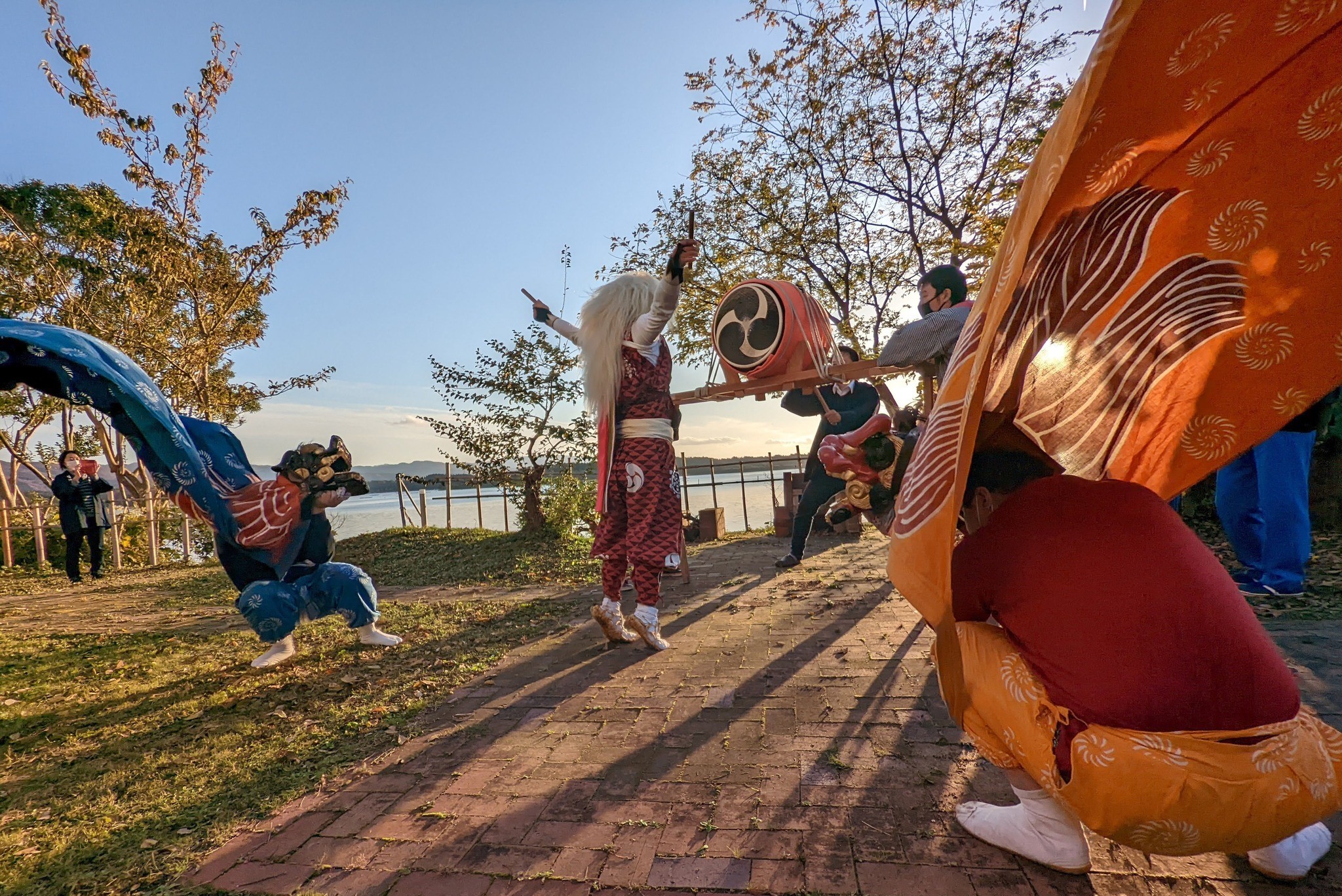 Sado’s Onidaiko can be divided into five different styles based on characteristics of their dancing, drum rhythm, costumes, and props. The most common is the “Katagami-style,” practiced mainly in the center of the island. This style is thought to have been influenced by Noh, as the tempo is generally slower and the Oni dance using “Suriashi” (sliding steps), a move distinctive to Noh. Occasionally, “Shishi” (Chinese lions) join the performance.