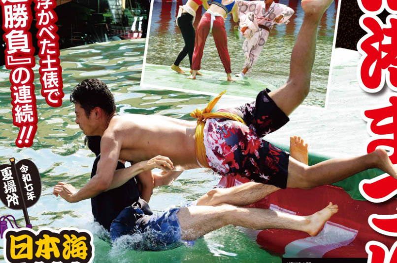 Akadomari's summer festival. The main event of the day is the "Grand Sumo Tournament on the Sea of Japan" held in a ring floating on the sea. The audience cheers for the wrestlers as they struggle to slide and fall on the swaying ring. There are performances by local performing arts groups, sales of local products, and a beer garden. At the end of the festival, fireworks light up the night sky.