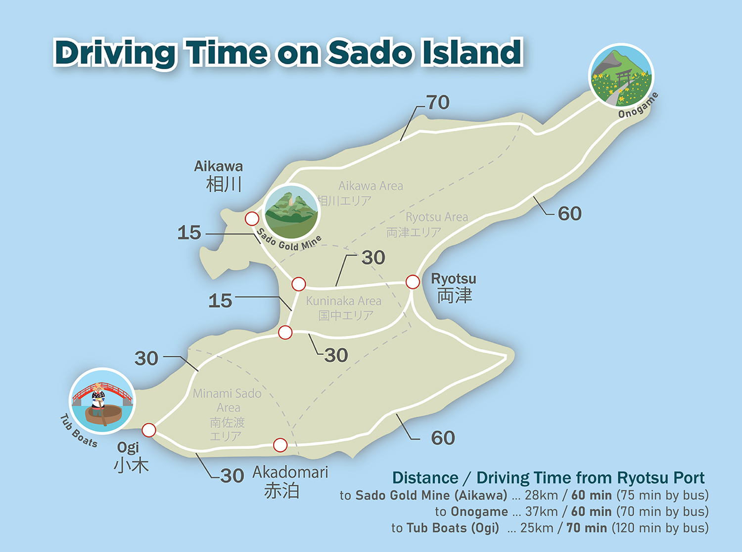 Ryotsu Port → Aikawa (Sado Gold Mine): ~50 minutes by car.