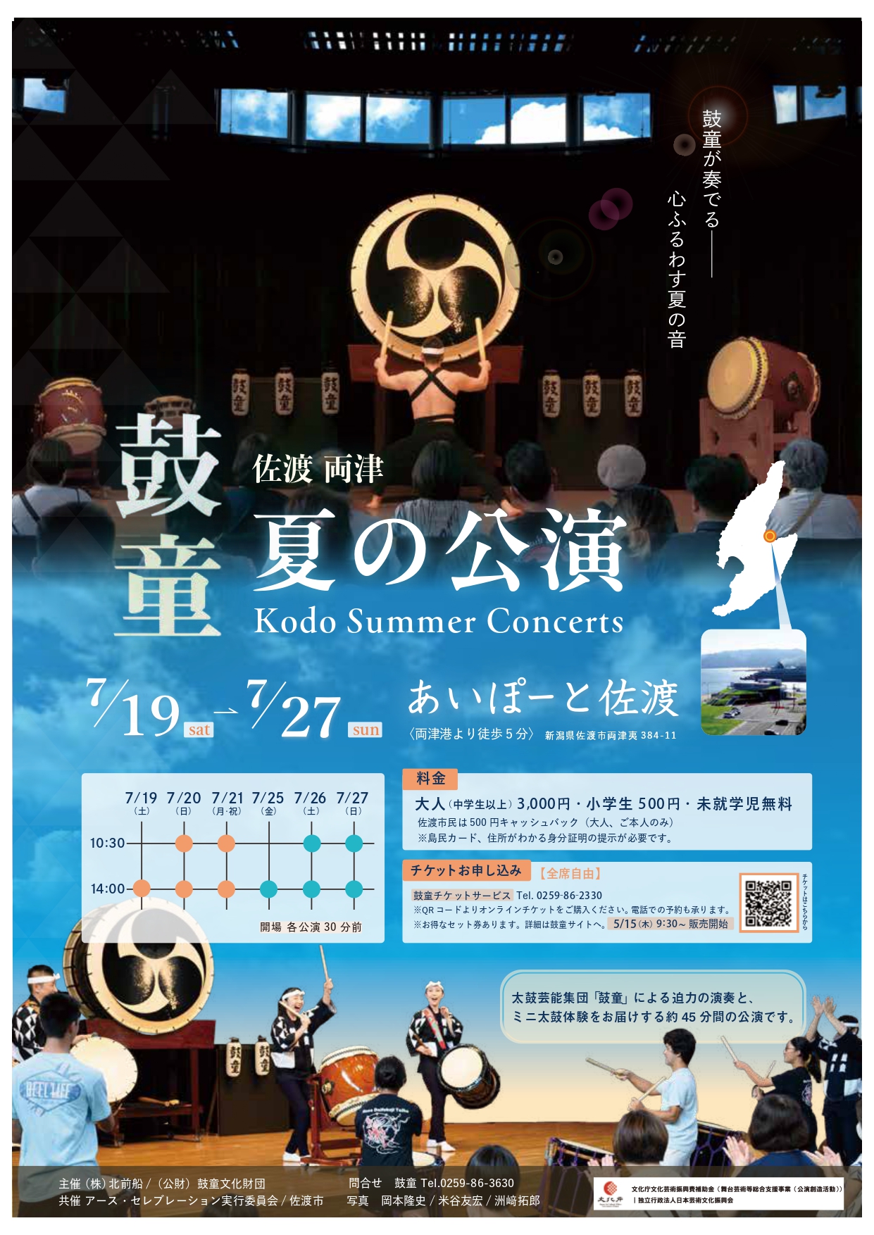 佐渡を拠点に創立から44年目を迎えた、太鼓集団 鼓童。 その本拠地だからこそお届けできる、アットホームで特別なひとときです。今年の夏は佐渡の表玄関 両津港から徒歩5分、あいぽーと佐渡での開催!間近で味わえる太鼓の響きを、ぜひお楽しみください。