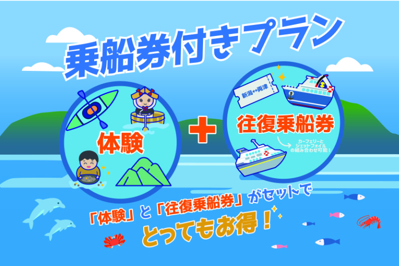 「サドベンチャー! 乗船券付きプラン」は、体験商品と佐渡汽船のカーフェリー・ジェットフォイルの往復乗船券がセットになったお得なプランです。