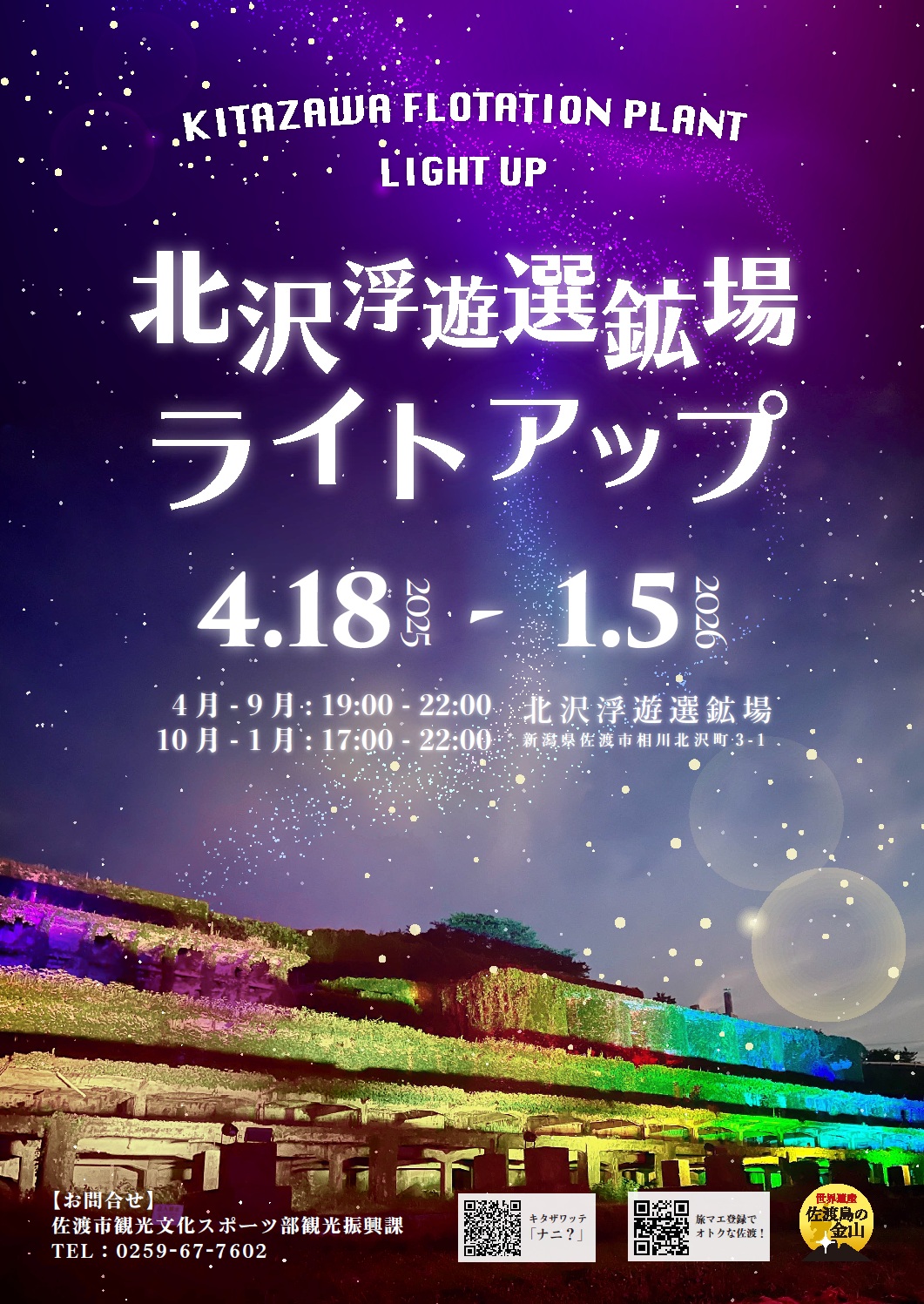 毎年恒例!夜の魅力ある観光地作りのひとつとして、今年も国史跡である北沢浮遊選鉱場を活用したライトアップを次のとおり実施します。