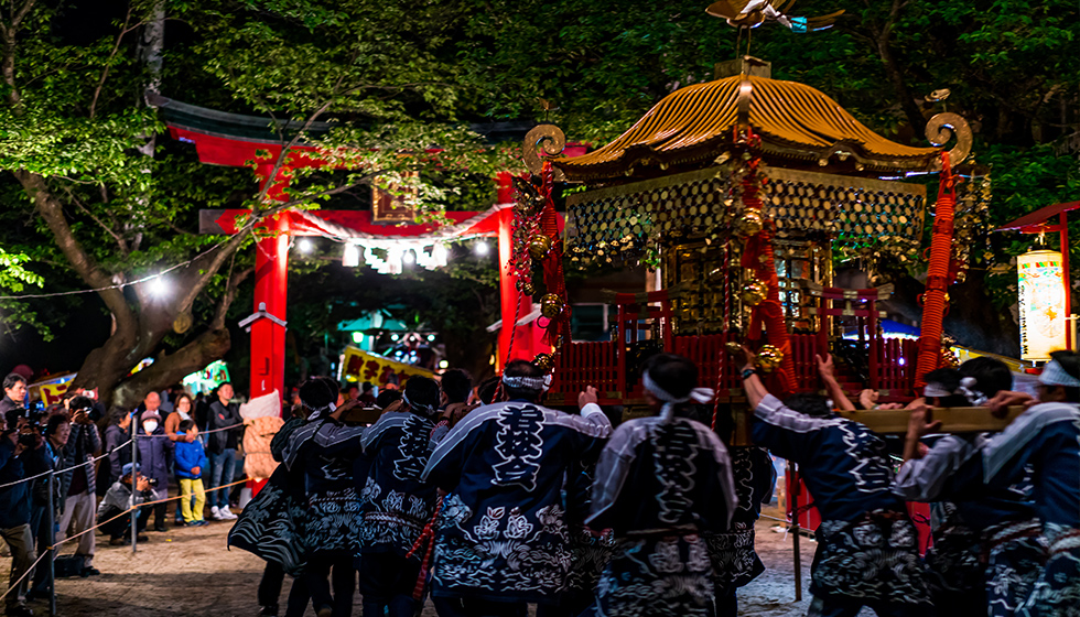 両津薪能は、本間氏(宝生流佐渡当主)の指導と協力を得て、佐渡における能の由緒と質を保持する役割も果たしています。加茂湖を望む椎崎諏訪神社能舞台にて、幻想的な雰囲気の中、能を舞います。民衆の手で支えられ育まれてきた伝統能をご観賞ください。