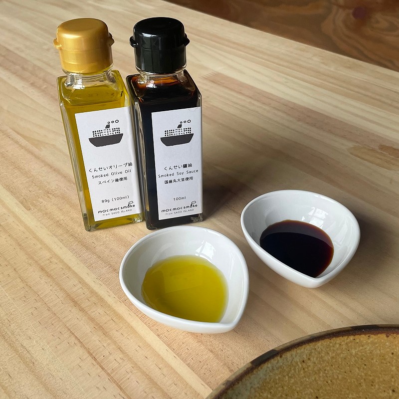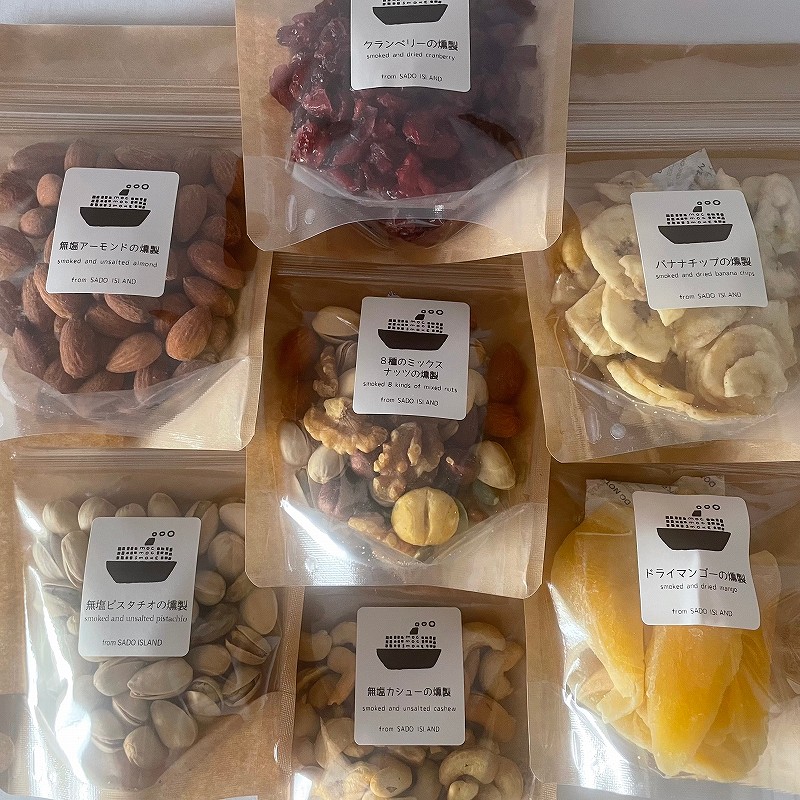 燻製作りに最適な環境を求めて佐渡に辿り着いた「もくもくすもーく」は、「8種類のミックスナッツ」「バナナチップ」「クリームチーズと種無し柿」の取り扱いのほか、醤油やオリーブ油など、調味料の燻製にも力を入れています。