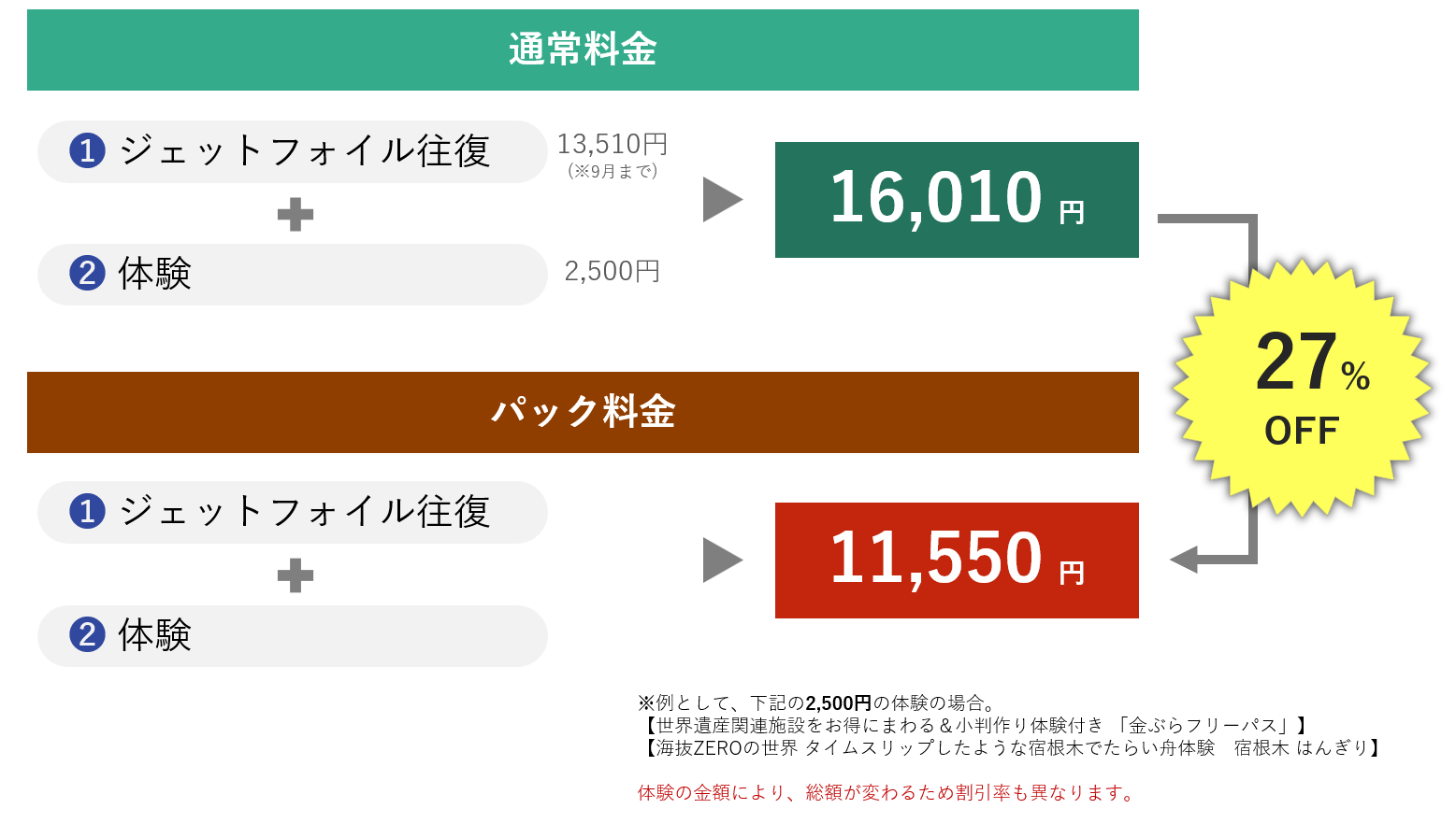 例えば、2,500円の体験に乗船券をつけて申し込む場合、下記のような金額となります。