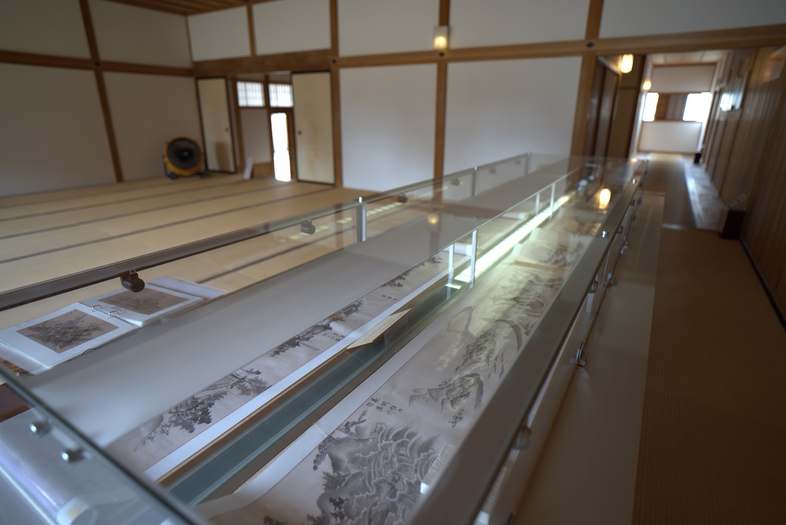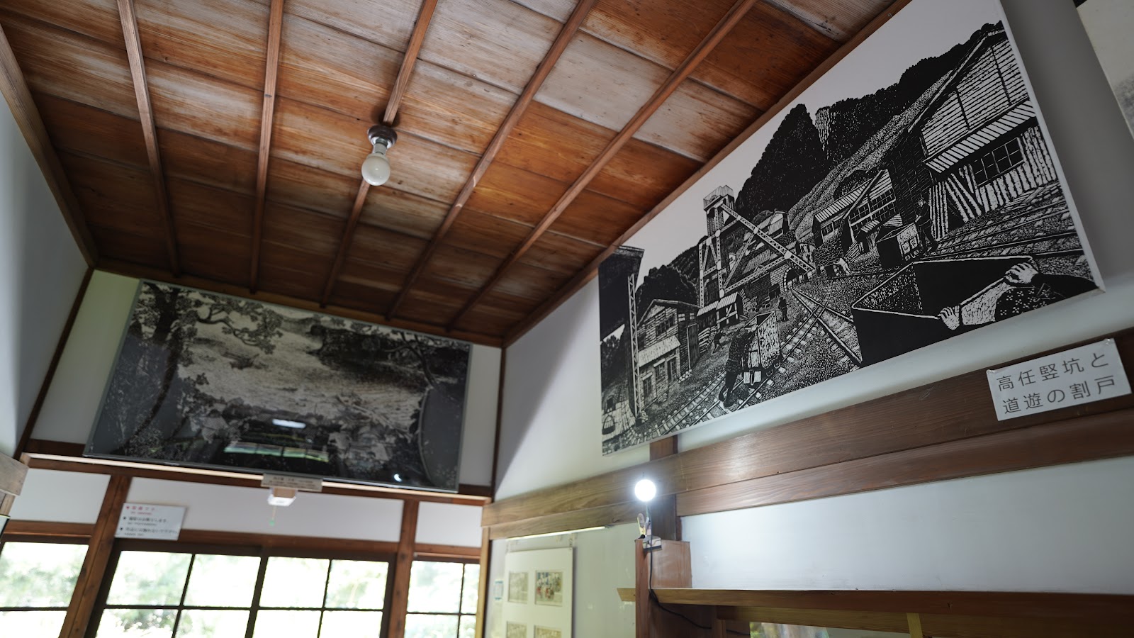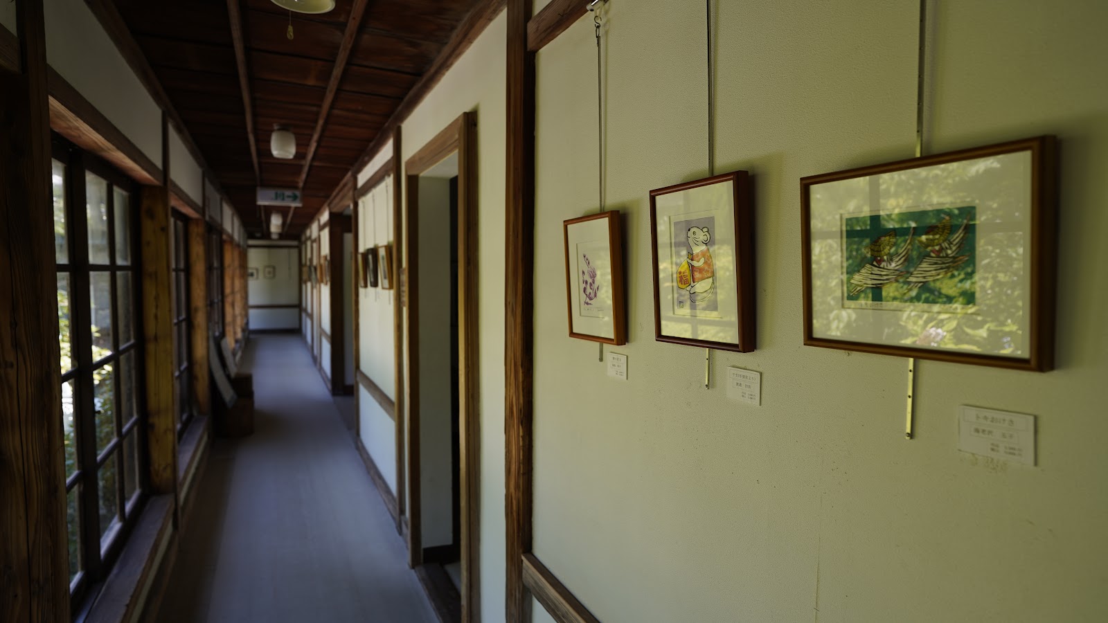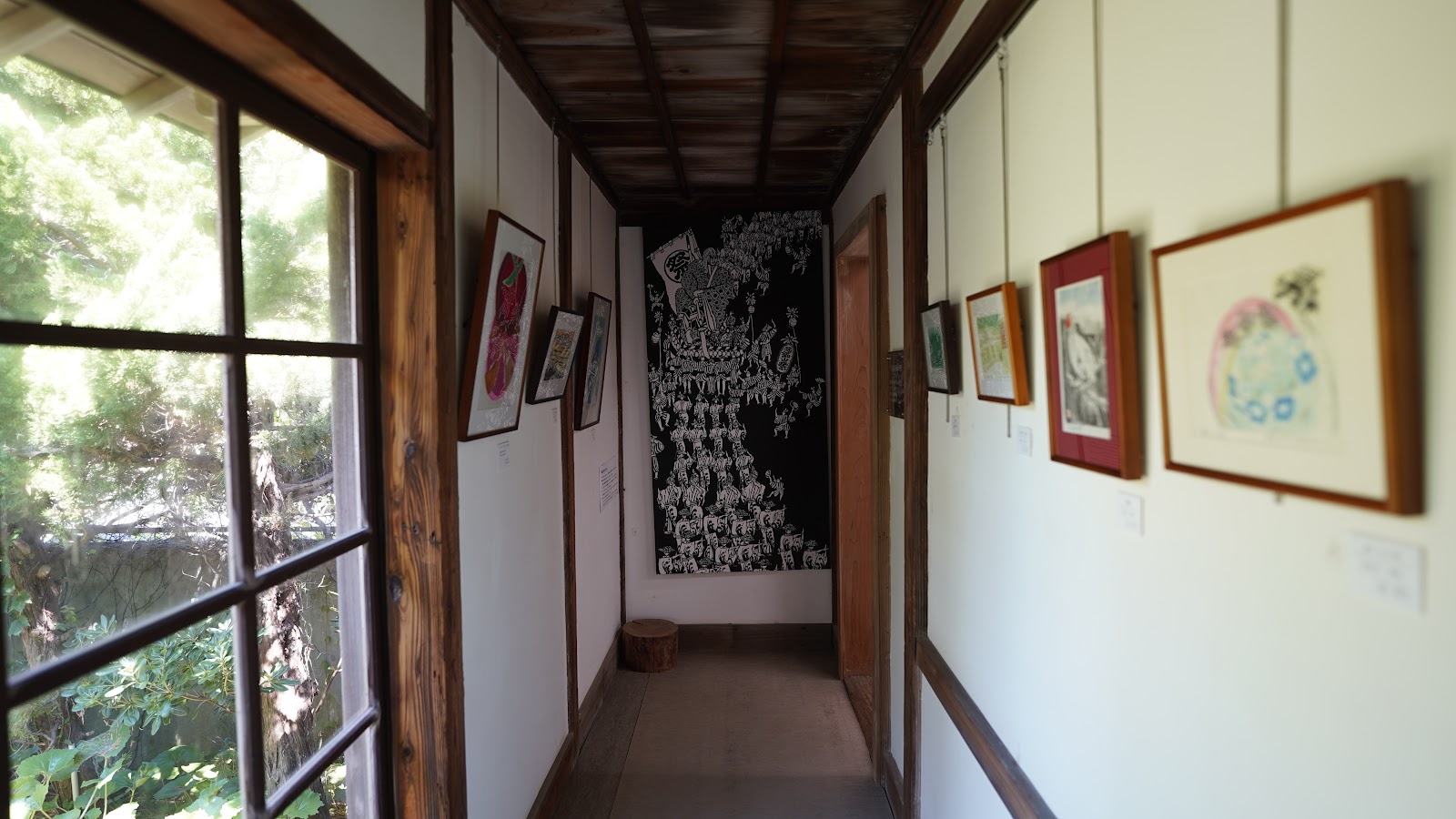 美しい庭を臨む廊下に飾られたハガキサイズのものや、島の支援と文化を一枚に描写した横6m×縦4mの巨大な作品まで、多彩な版画に出会えます。