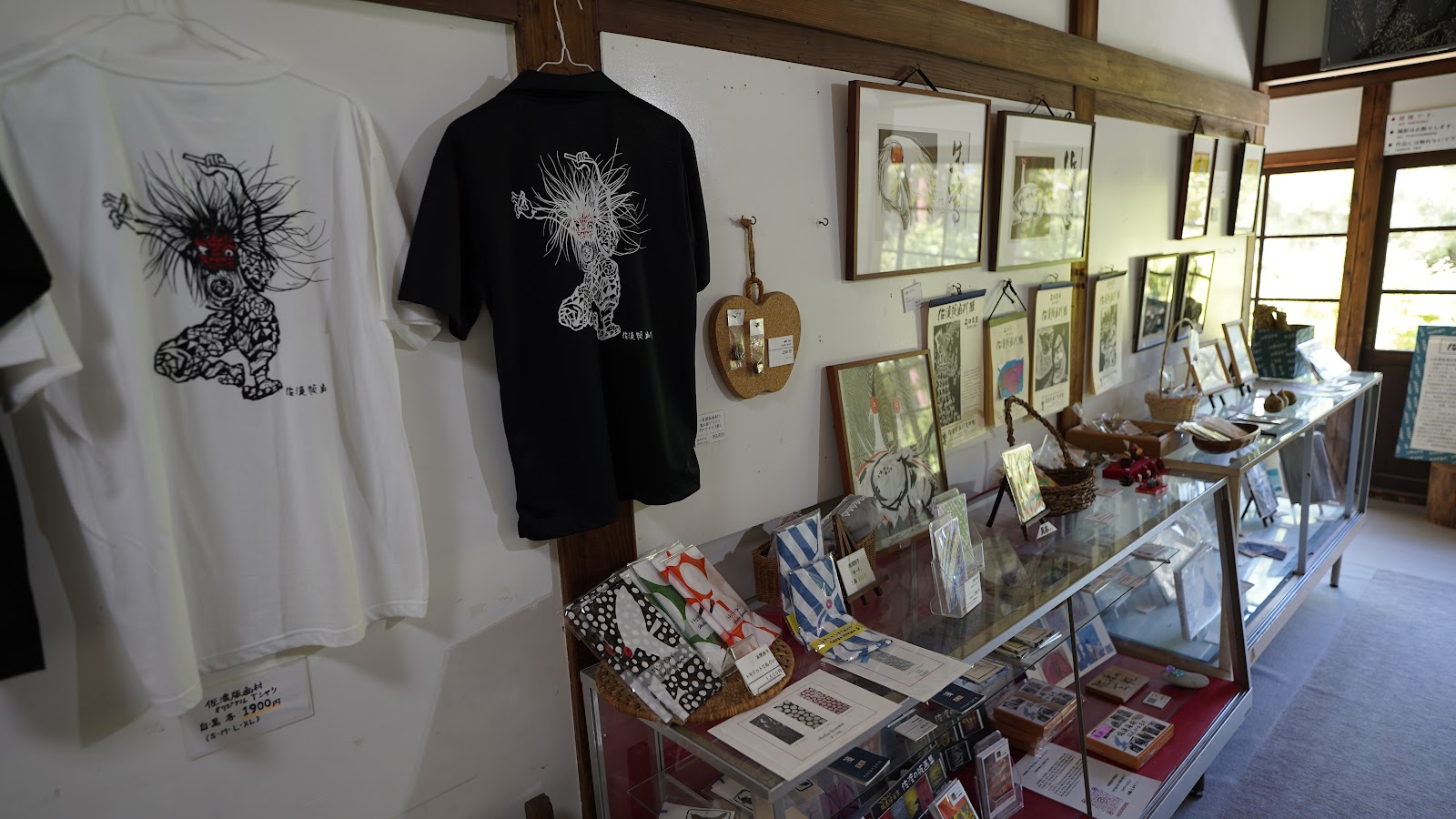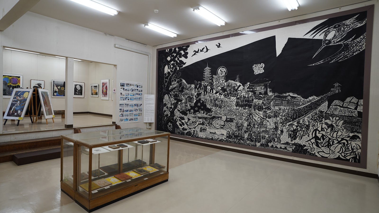 平成12年度から開催されている「全国高等学校版画選手権大会(はんが甲子園)」の作品も多数展示。事前予約で実際に版画を体験できる教室のほか、お土産コーナーには、カレンダー、Tシャツなど版画を使用したさまざまなグッズが並んでいます。