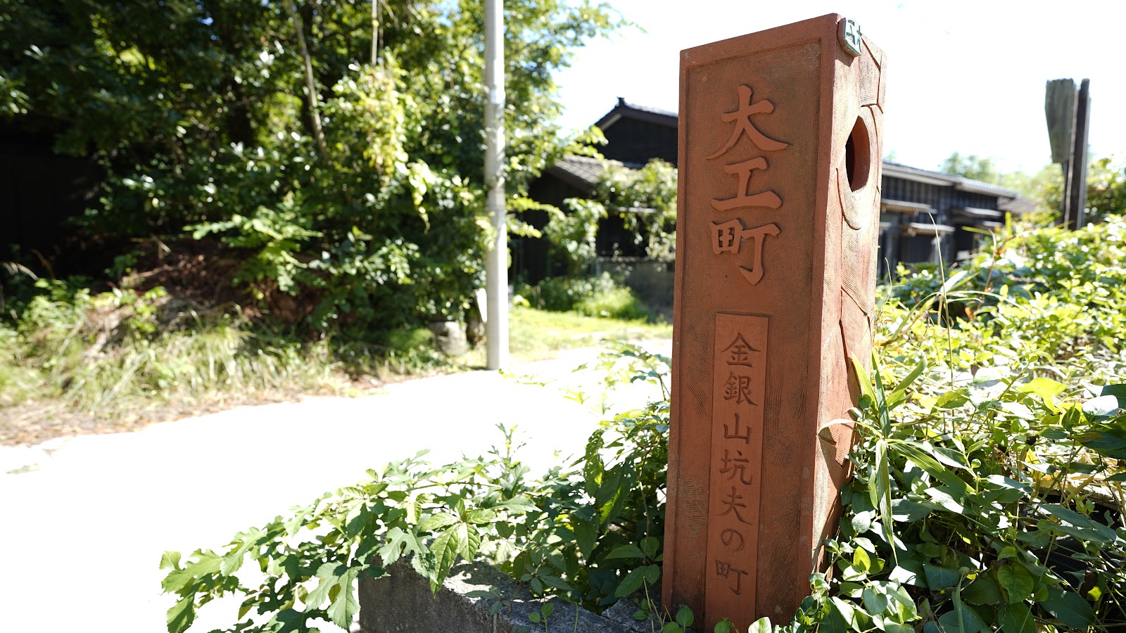 また、相川の町の通りには、赤茶色の色が特徴の無名異の土から作られた「標注」があちらこちらに建っています。標注は全部で25個。鉱脈の発見から急速に鉱山開発が進んだ江戸時代の初め、初代佐渡奉行の大久保長安(おおくぼながやす)によって職業別に町が割り当てられたなごりを、町名の書かれた標注から感じることができます。