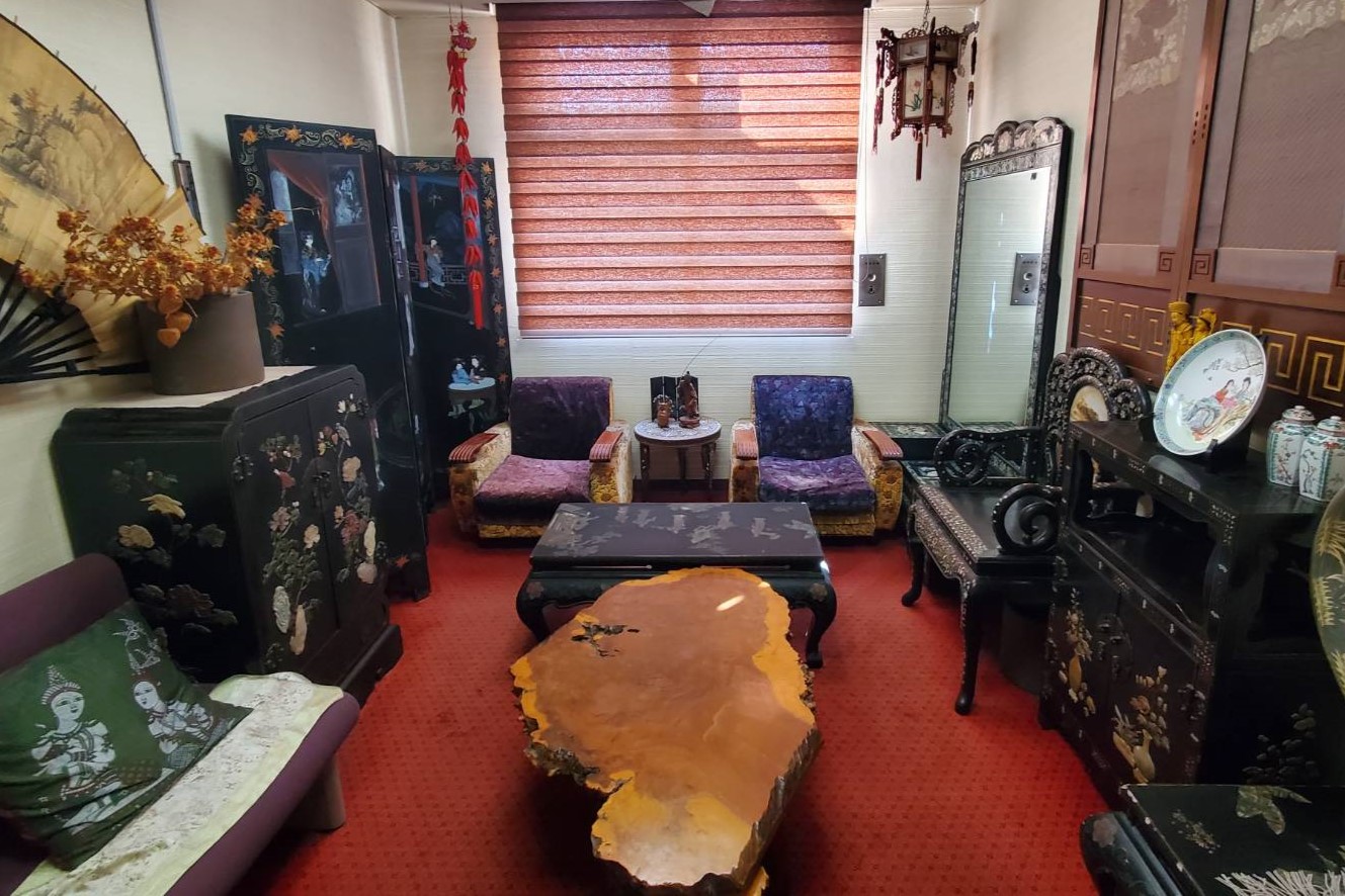 ロビーに入ると目に入る中国風の木製家具は寛人さんの曾祖父のコレクションのひとつ。幼い頃は、螺鈿のタンスの中におもちゃを入れるなどして遊んでいた寛人さんにとって、これらも “生まれた時から自宅にあった当たり前のもの” だったのだそう。
