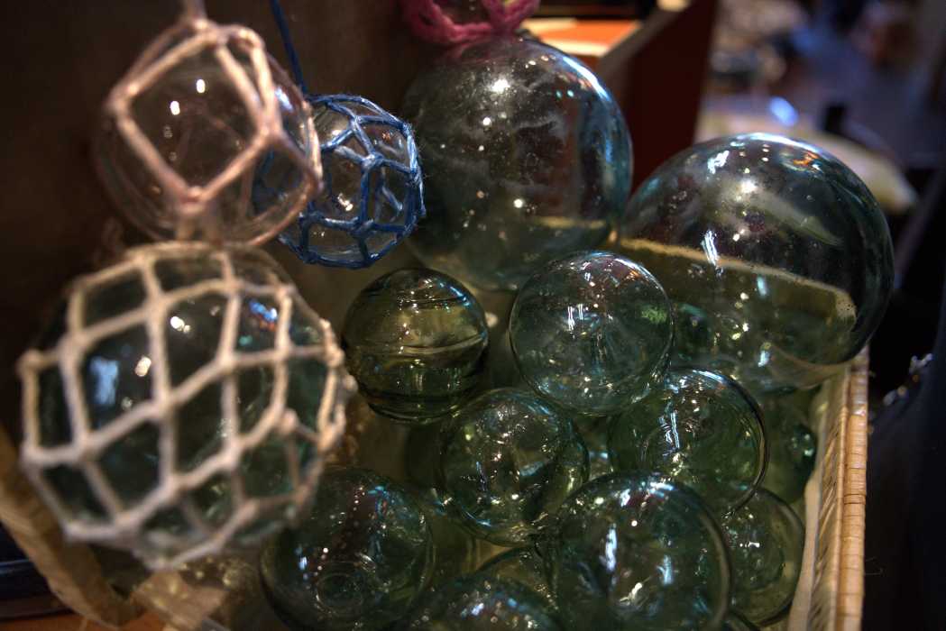 ウランガラスの浮き玉。中サイズから大きいサイズまで、サイズも使い方も色々。浮かせてみたり、置いてみたり、吊るしてみたり。