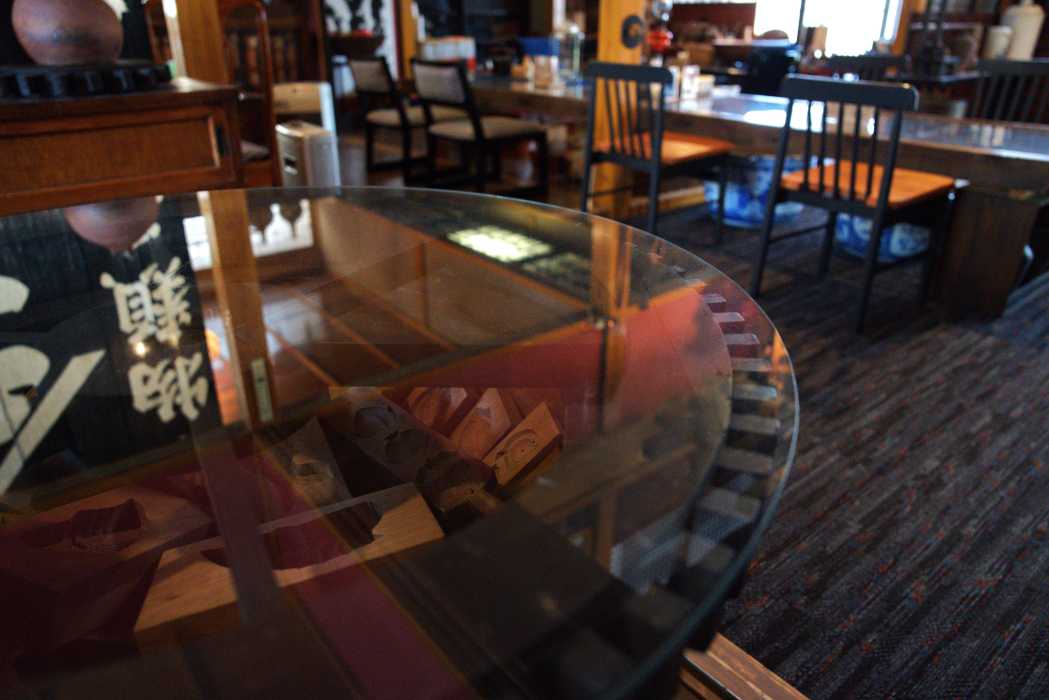店内には遊郭の建具を使って作られた机や、臼と水車の歯車を再利用したものなど、どれも個性の塊。自分たちで手がけたものだそうですが、存在感たっぷりの家具は飾り方にも目を見張るものがあり、古民具の新しい使い方を提案しているようにも感じました。
