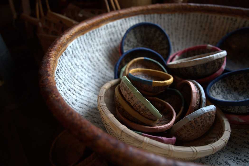 大中小さまざまなサイズや色が並ぶ「一閑張」は、昔の紙を何重にも貼って、柿渋の塗料でさらにコーティングしているのでとっても丈夫! 洋服やタオルを入れるバスケットのように使うことができます。旅のお土産にもぴったり。