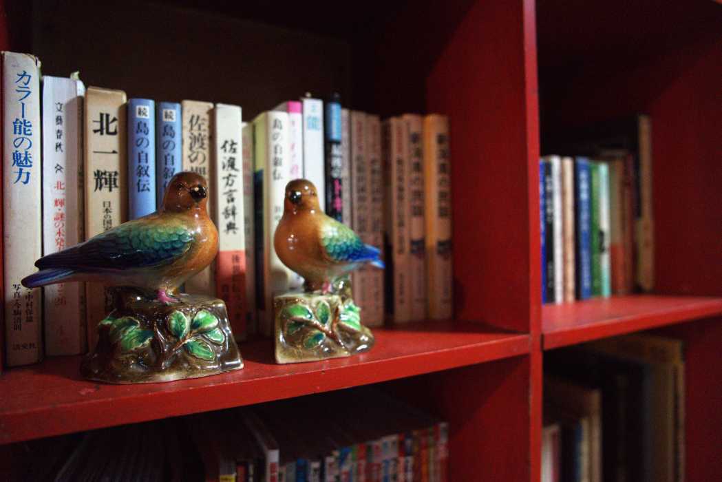 佐渡や両津地区にちなんだ書籍が並ぶ本棚。部屋には昔懐かしい「メンコ」の展示もずらり。コレクションの数々をひとつずつ眺めてみて。