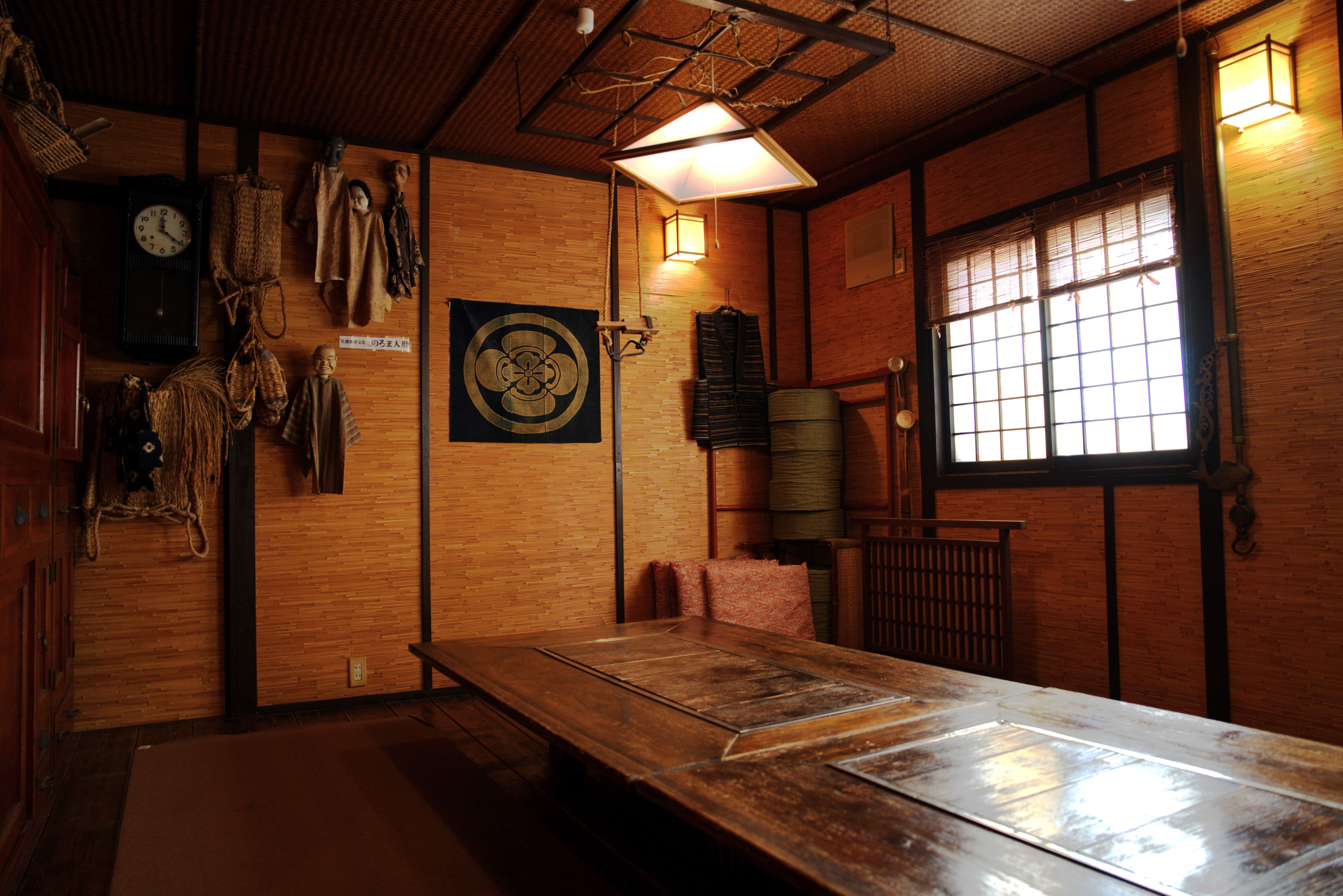 会食場「ぜんたろう」 は8名様まで利用可能。利用したい場合は宿泊予約時に申し出を。以前は炭火焼もできる囲炉裏として使われていたこともあり、鉄なべをかけていた様子が道具からうかがえます。ほかにも、創業当初に使われていた「喜楽旅館」の看板や四段重箱など、思い出が詰まった品々も。