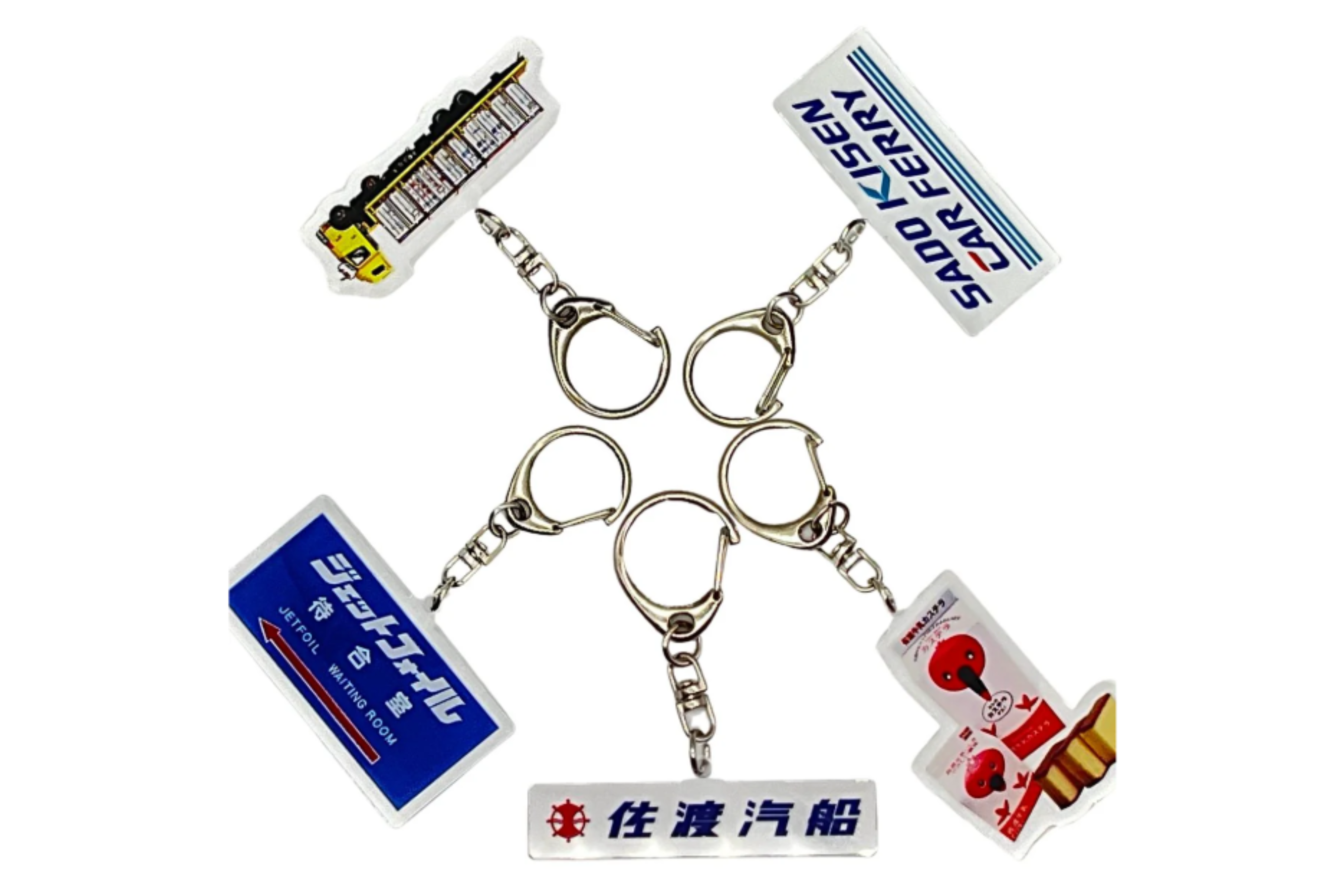 カプセルの中には、佐渡汽船の船内や港で長く使われてきた掲示物やロゴ、看板などをモチーフにしたアクリルキーホルダーが入っています。どれも昔からそこにあったものなのに、改めて見ると色使いやフォントがレトロでかわいらしく、心をくすぐられます。