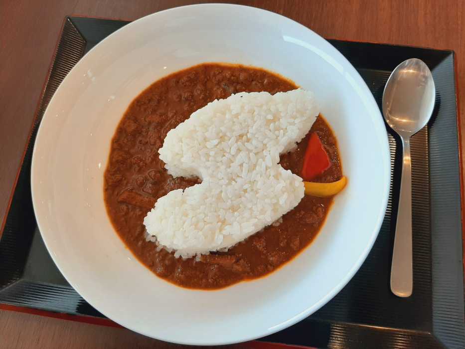 「佐渡島カレー」の実物。中央の島型ライスがかわいらしい名物メニューです。船内や各港で食べられるメニューには「佐渡汽船名物 ながもそば」「ご宝瓶」があります。ガチャのモチーフを実際に探したり、食べて楽しもう!