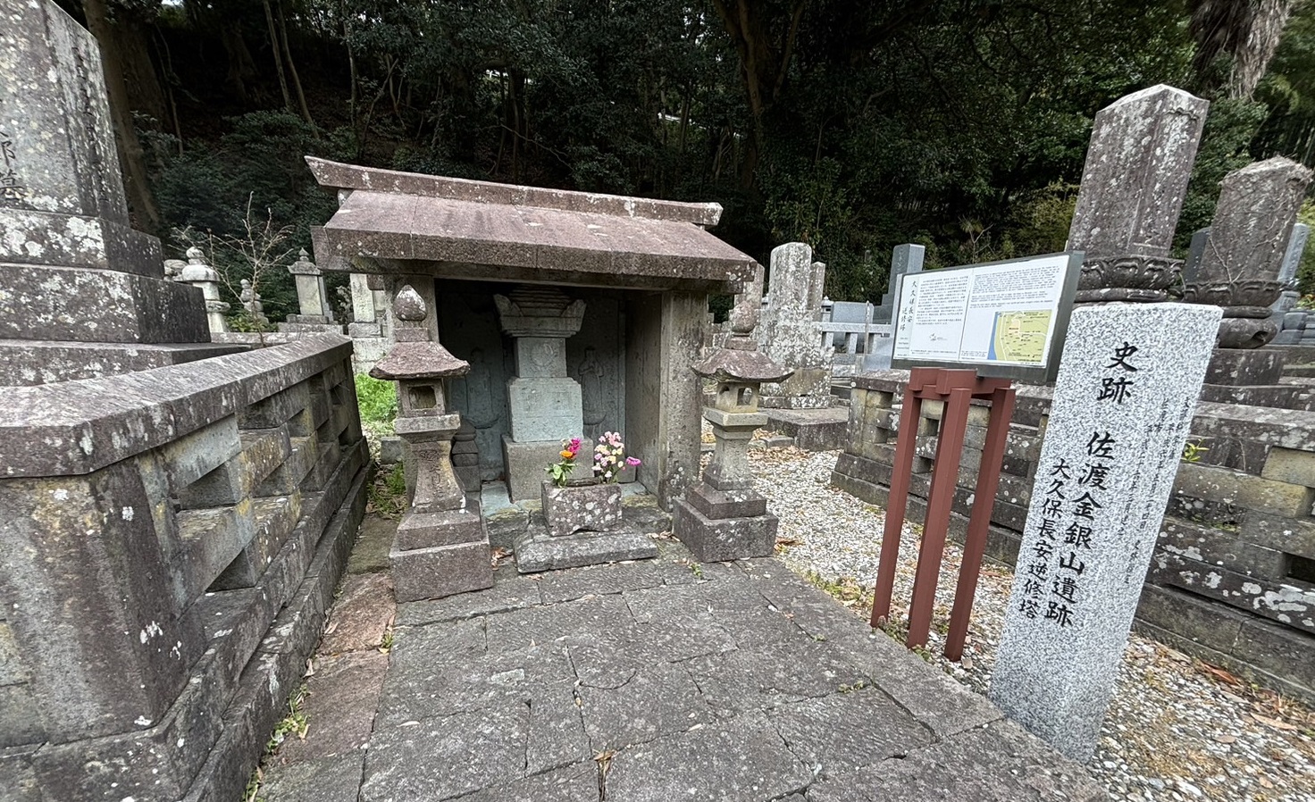 佐渡相川ふれあいガイドでご案内できるコースは、「佐渡奉行所周辺散策コース」や「寺町コース」など全部で6コース。相川の京町通りから一筋南側に入った会津町には、佐渡相川の鉱山及び鉱山町の文化的景観として登録されている「駄栗毛家住宅」のプレートがありますし、町名と町の特徴を指し示す「標注」のほか、隠れた絶景スポットもあります。大久保長安が建てたとされる逆修塔をはじめ、相川で功績を残した人のお墓や供養塔が集まる「寺町」は、特に好きな場所です。