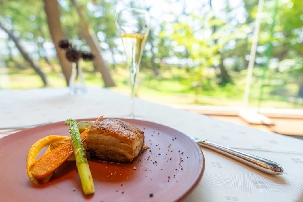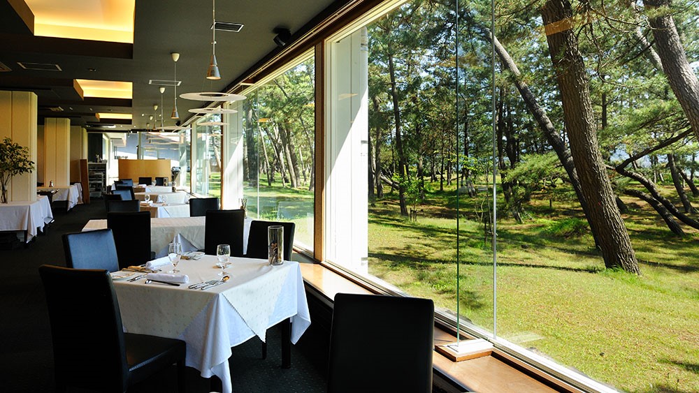 せっかくなら特別な一日をさらに心に残るものにしたい。そんな時におすすめしたいのが、人気リゾートホテル「Ryokan 浦島」内のフレンチレストラン「La plage(ラ・プラージュ)」です。店名が意味するのは「海辺」。その名の通り、ガラス張りの窓から望む「越の松原」と、その奥に見える佐渡の美しい海景は、料理と同じくこの場所でしか味わえないごちそうです。夕暮れ時にはロマンティックな雰囲気を演出。時間とともに移ろう空の色も楽しめます。