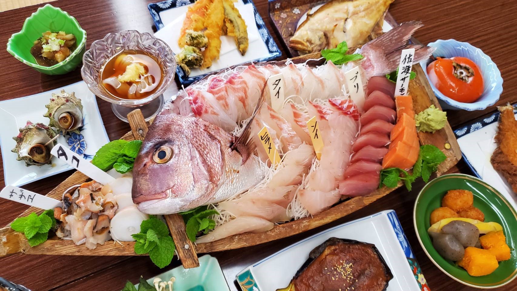 佐渡産の食材を積極的に取り扱う「サドメシラン」登録店にふさわしく、地魚の船盛りや佐渡牛のしゃぶしゃぶ、季節の山菜や地元の方が育てた野菜を使った手作りの小鉢料理など、どれもほっとする味わいです。海産物はその日獲れたものを使うこともあり、釣りが趣味なら自分で釣った魚を料理してもらうことも可能(要相談)。館主の石塚さんは和食で修行した料理人で、魚を捌く手さばきには職人の技が光ります。