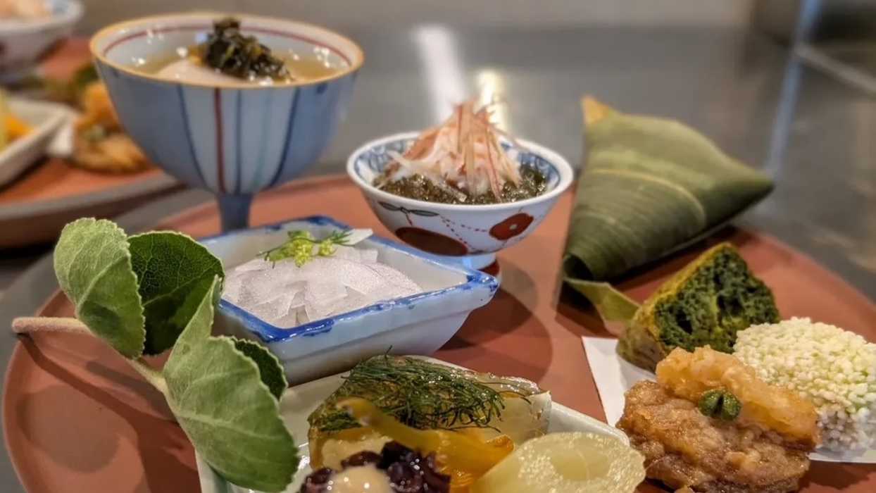 26歳で佐渡に孫ターンした智子さんは、子どものころから料理をふるまうことが大好き。飲食店をはじめると夫婦で決意してからは、横浜市にある発酵料理を得意とする日本料理店「楽只(ラクシ)」で経験を積みながら、野菜ソムリエや出汁マイスターといった資格を取得。発酵がもたらす深いうま味と、身体にやさしい調理法を取り入れた料理は、月ごとに変わる創作の世界! ジャンルにとらわれない自由な発想が一皿一皿を生み出します。とくに、佐渡の代表的な焼き物「無名異」のお皿に並べられた前菜の数々は、見た目もかわいらしく、とっても華やか。季節の息吹を込め、佐渡の豊かな恵みを新しい表情で届けてくれます。