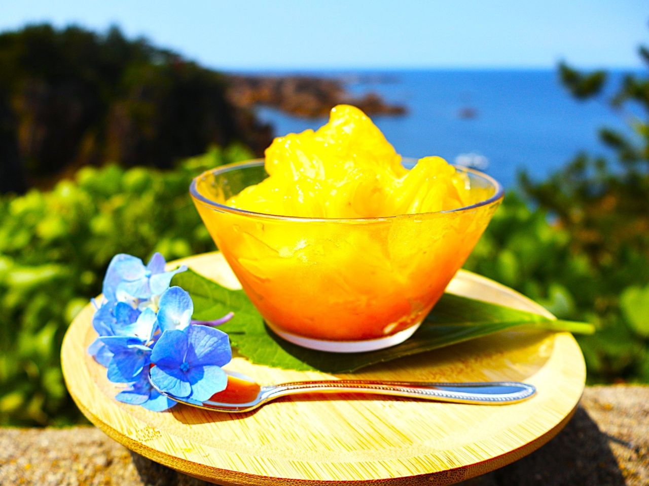 「尖閣湾ブルー」は尖閣湾揚島遊園に入館してすぐの軽食堂「あげしま海かふぇ」と、園内の橋を渡った先にある「展望台茶屋」の二か所で注文できますが、実はこの展望台茶屋でしか販売していない冷菓メニューがもうひとつ…。冷凍した佐渡のおけさ柿をまるごとひとつ削った、その名も柿かき氷! 柿100%のねっとり感と自然の甘味は、既製のアイスクリームでは出せない特別な味です。こちらも夏季限定、数量限定の要チェック商品です!