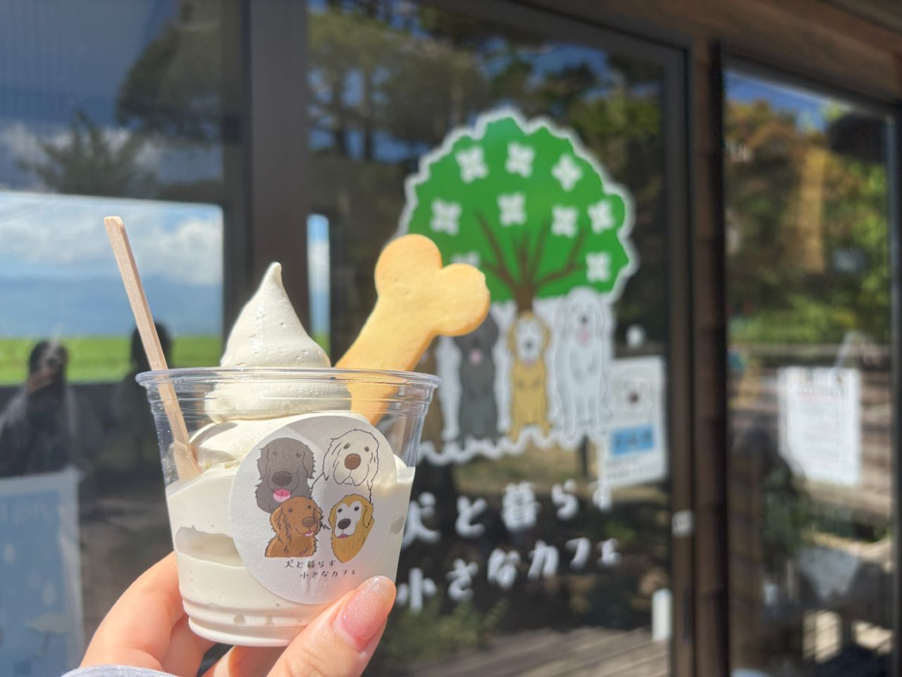 「犬と暮らす小さなカフェ」は2024年に畑野地区にオープンしたカフェです。看板メニューはソフトクリームのモフソフトシリーズ。4頭の看板犬の名前と毛色にちなんだ4種類から味を選べます。チョコレートコーティングの「げん君」、きなこ&くろみつの「きなこ君」、ホワイトチョコレートコーティングの「O次郎君」、焦がしキャラメルチョココーティングの「かい君」と、どの子にしようか悩んでしまうお客さんが続出!