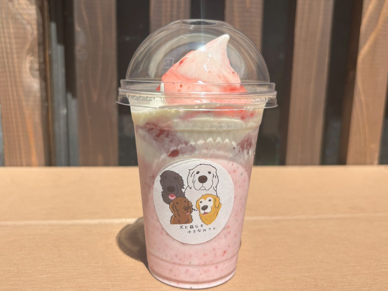 モフソフト以外にも、SUZUKI COFFEEのオールドビターブレンドを使用した深みとコクのあるこだわりのコーヒーや、地元の老舗パン屋「中川製パン所」で型をオリジナルオーダーしたクッキーなど、メニュー豊富。モフソフトがいつも以上に溶けやすい暑い日には、スムージーやシェイクがおすすめとのことで、この日は「モフイチゴスムージー」を注文。溶けたソフトクリームが甘酸っぱいイチゴスムージーと混ざることで、よりまろやかな口当たりが楽しめます。カップに貼られたシールもかわいいですね。