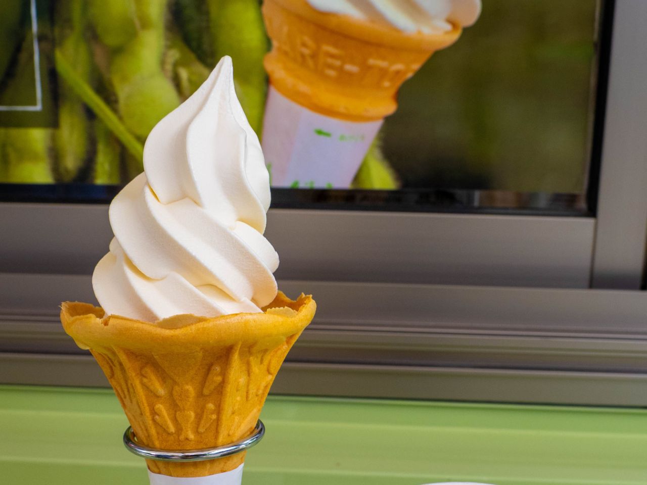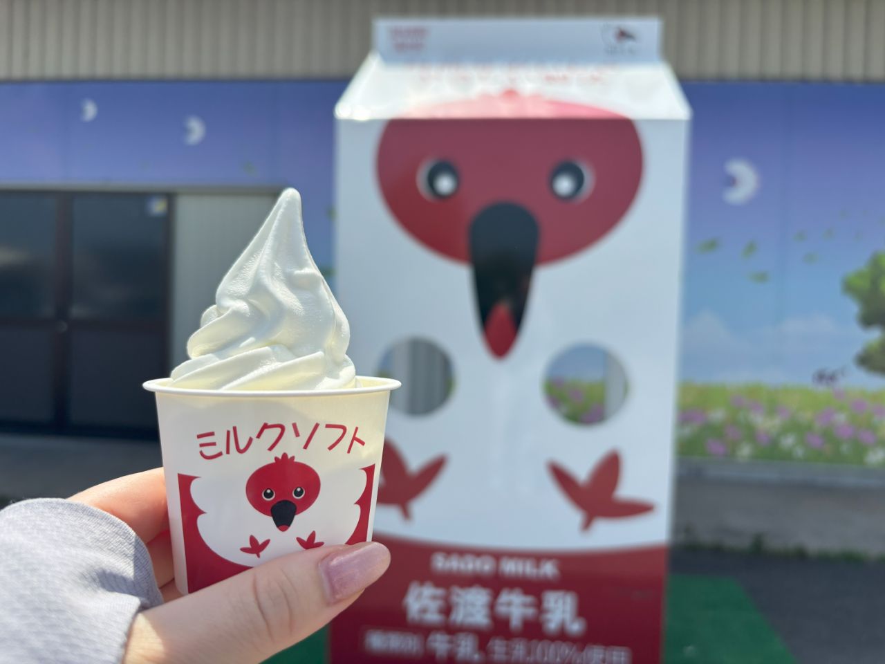 どのソフトクリームもトキデザインのカップと、先までソフトクリームがたっぷり入ったコーンの2つから容器を選ぶことができます。ソフトクリームを楽しんだ後は「佐渡牛乳」の紙パックと同じデザインのフォトスポットでの写真撮影をお忘れなく!
