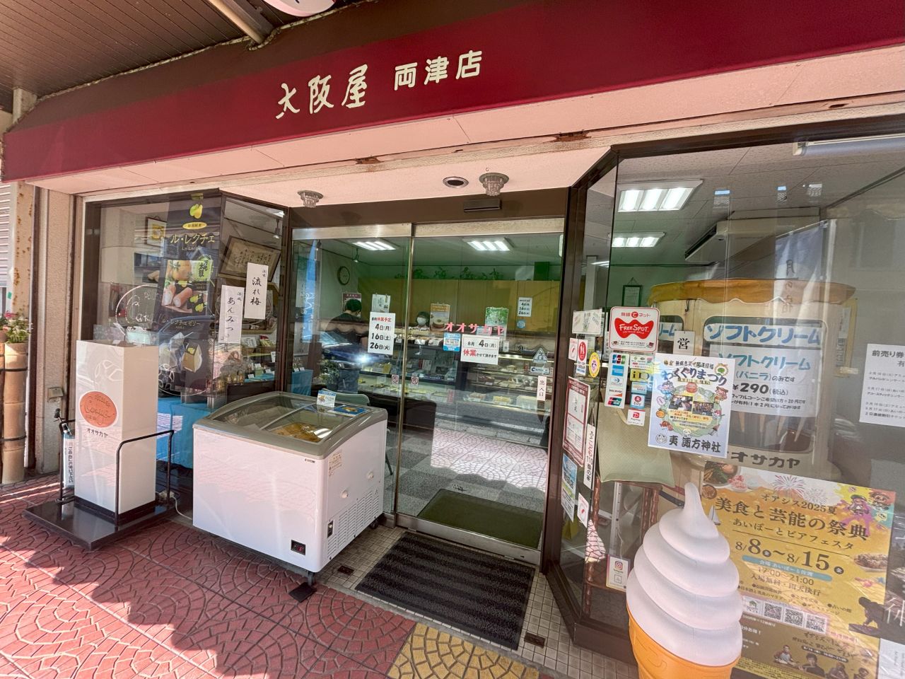 以前はチョコレート味やミックス味もあったそうですが、現在はバニラ味のみの提供。食べながら夷商店街を歩くと、まるで昔にタイムスリップしたよう。大阪屋の店内にはお店自慢のケーキや季節に合わせたお菓子もたくさん! ソフトクリームと同期間、季節限定商品として販売されている夏の代表銘菓・流れ梅も、ぜひ一度味わってみてください。