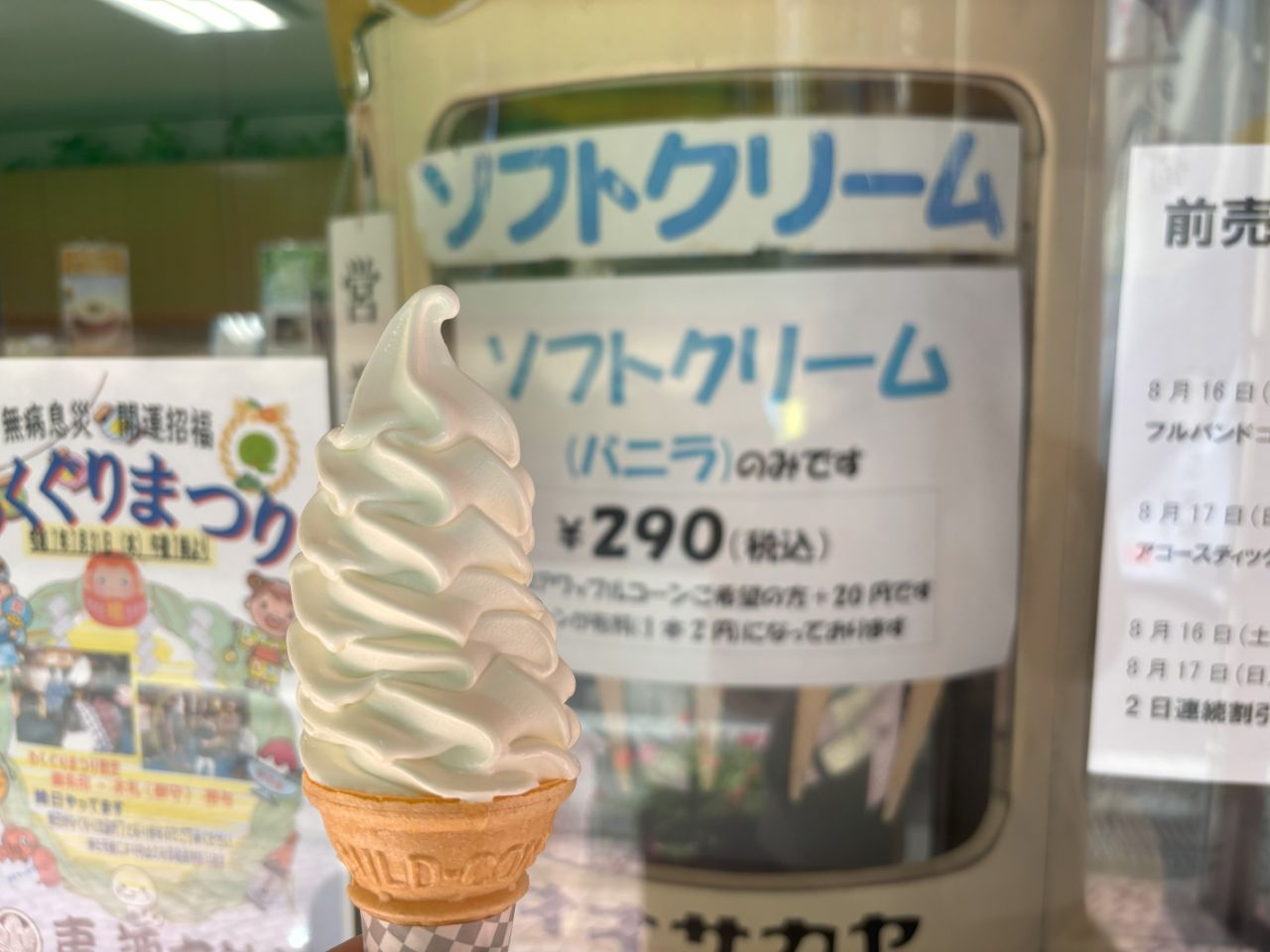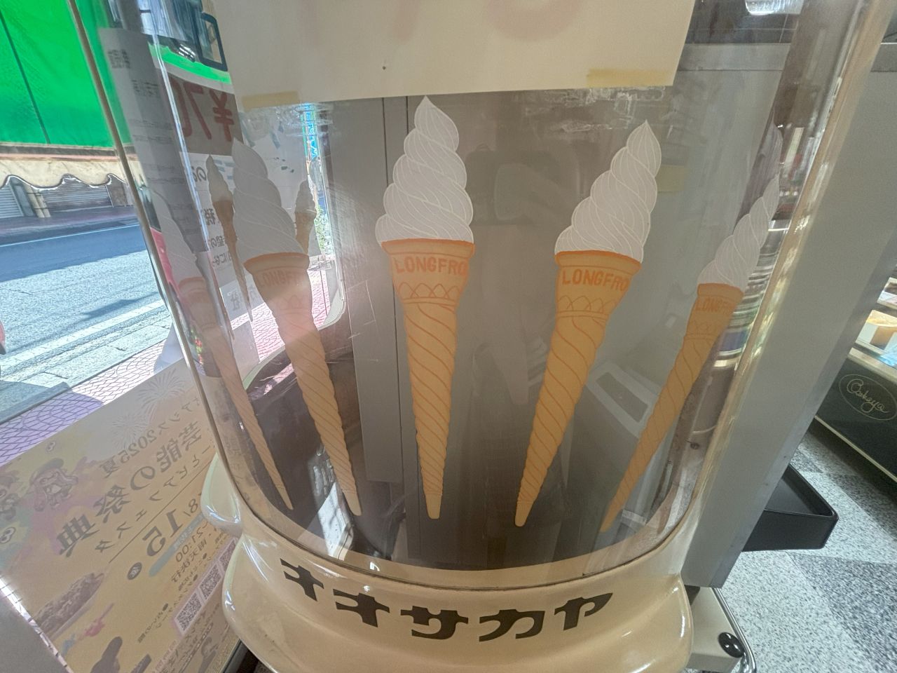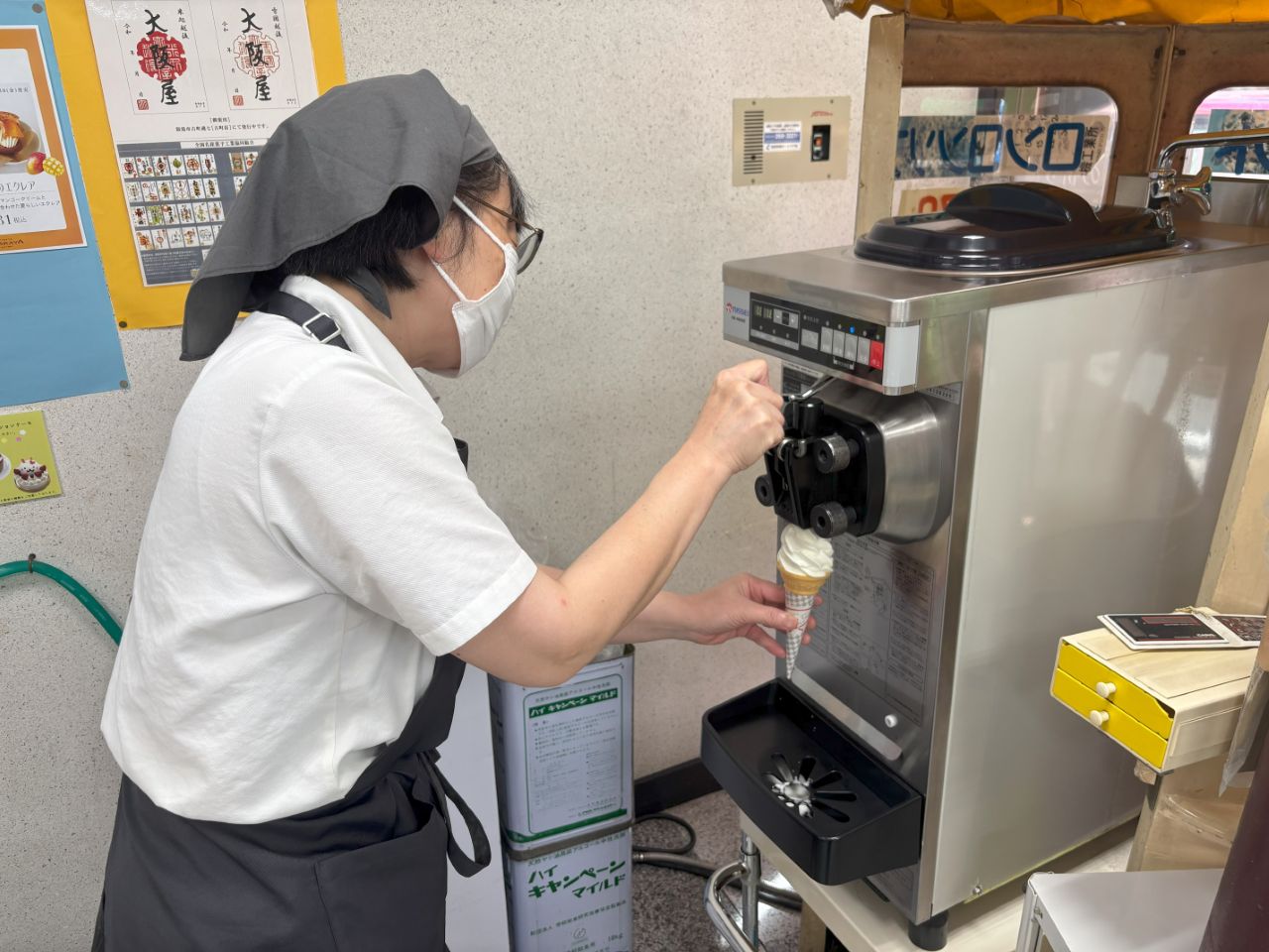 こちらのソフトクリームは、とにかく大きくてリーズナブル! 私も初めて注文した際には「まだ巻くの...!?」と驚いたほどのボリュームでした。「大きさは単にサービスが良いからだよ」と笑うオーナーの佐藤さん。販売当初は今よりも長いコーンで提供していて、ロングロングソフト、通称“ロンロンソフト”という愛称でたくさんのお客さんに愛されてきました。長いコーンが数年前に生産終了してしまい、通常の長さのコーンに戻った後も、当時の名残りと大阪屋からのサービスの気持ちとして長めに巻いているそうです。