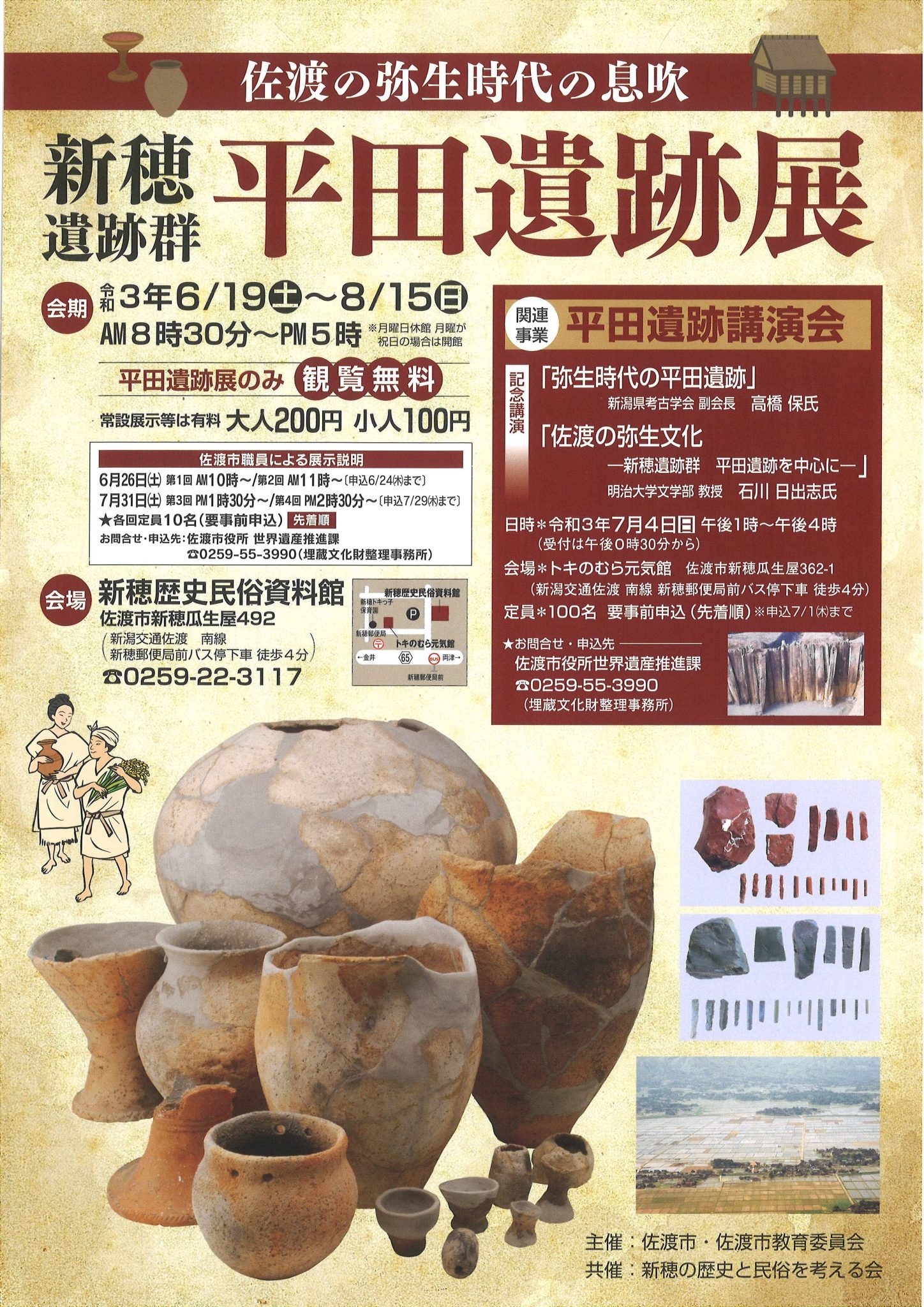 - 平田遺跡展のみ観覧無料。常設展示等は有料(大人200円、小人100円)