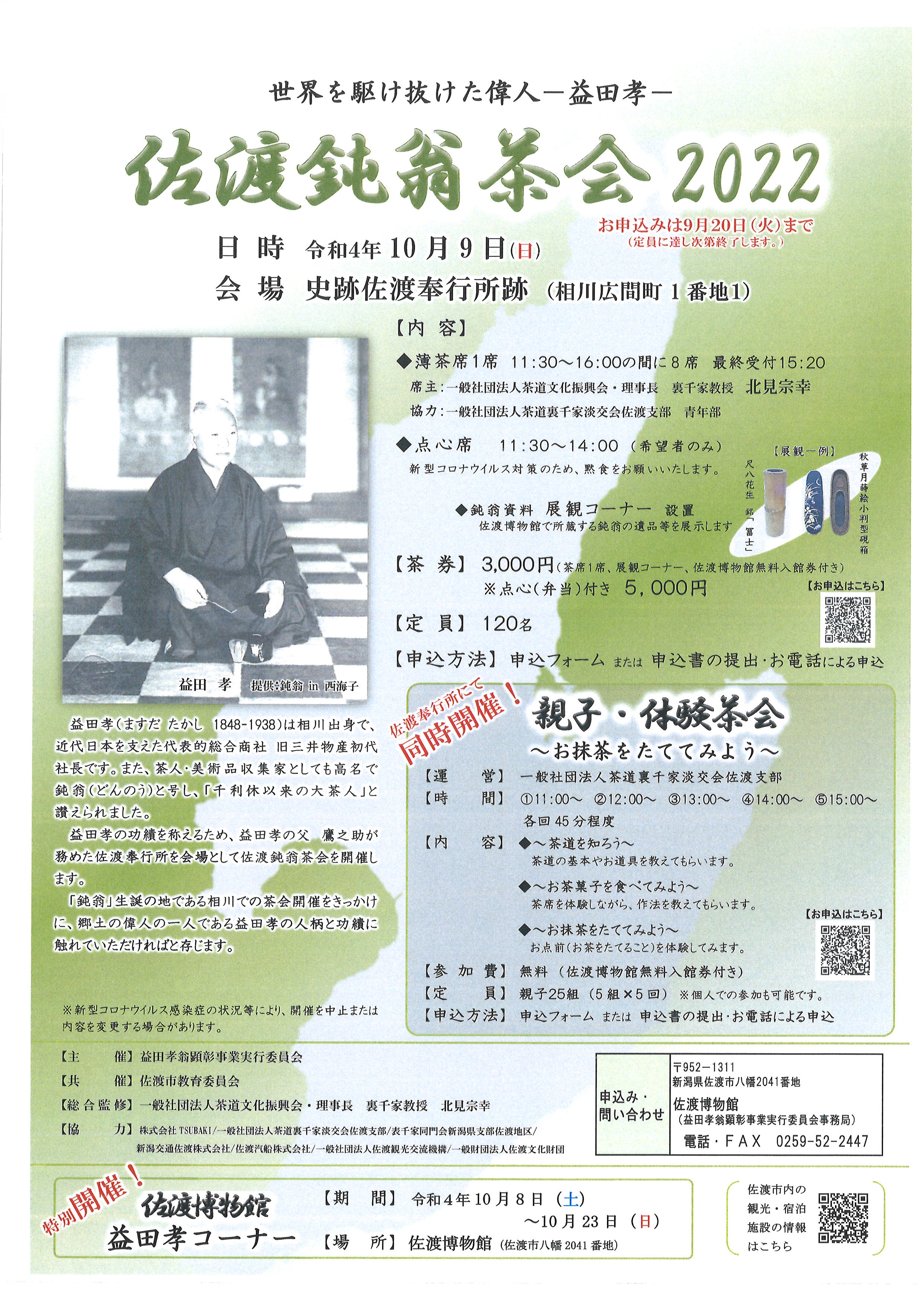 佐渡出身の偉人「益田孝(鈍翁)」を顕彰する目的で、2017年より開催している「佐渡鈍翁茶会」が3年ぶりに開催されます。