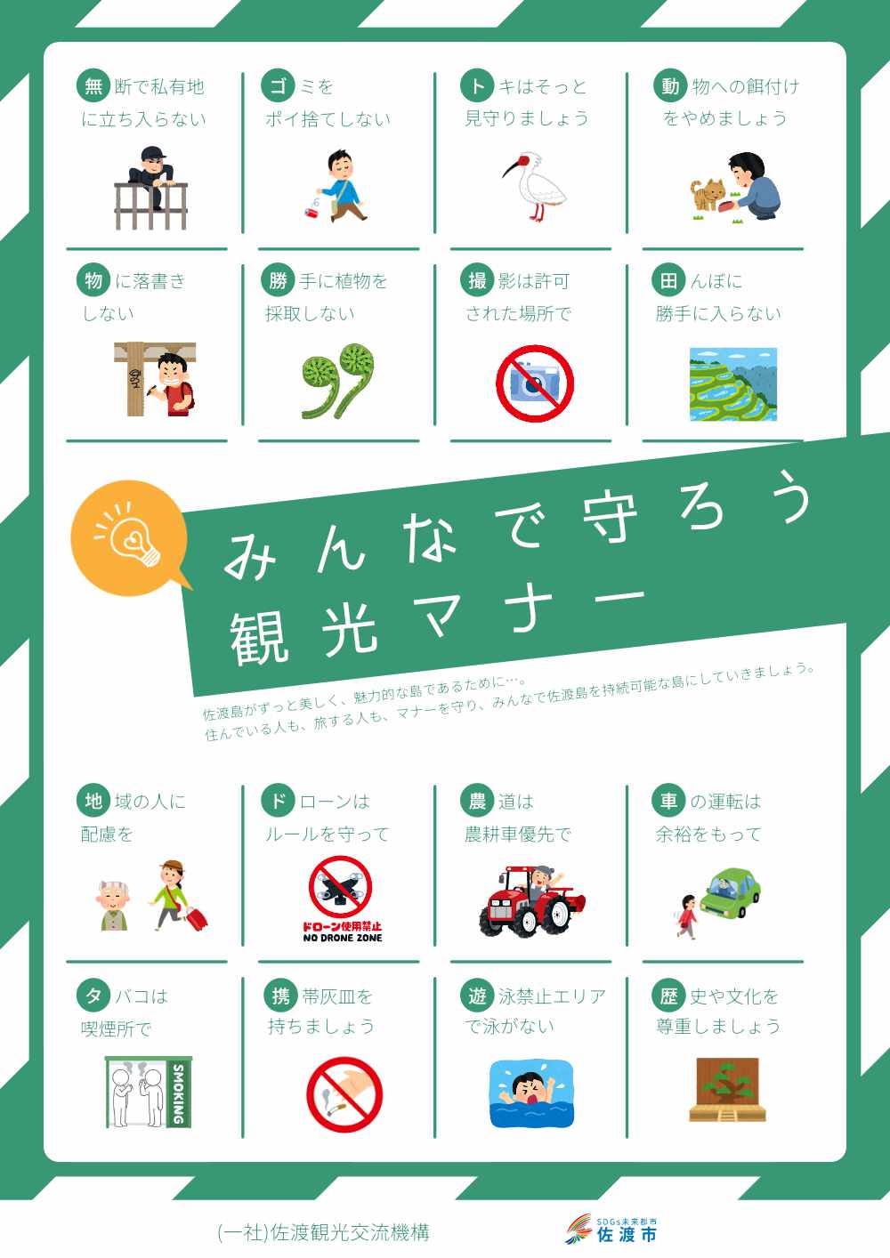 佐渡は「佐渡島(さど)の金山」の世界遺産登録を目指し、観光客の皆様にも多くご来島いただいております。島内を観光する際には、観光マナーを守って佐渡観光をお楽しみくださいますようお願いいたします。佐渡島がずっと美しく、魅力的な島であるために、ご理解ご協力のほどよろしくお願いいたします。