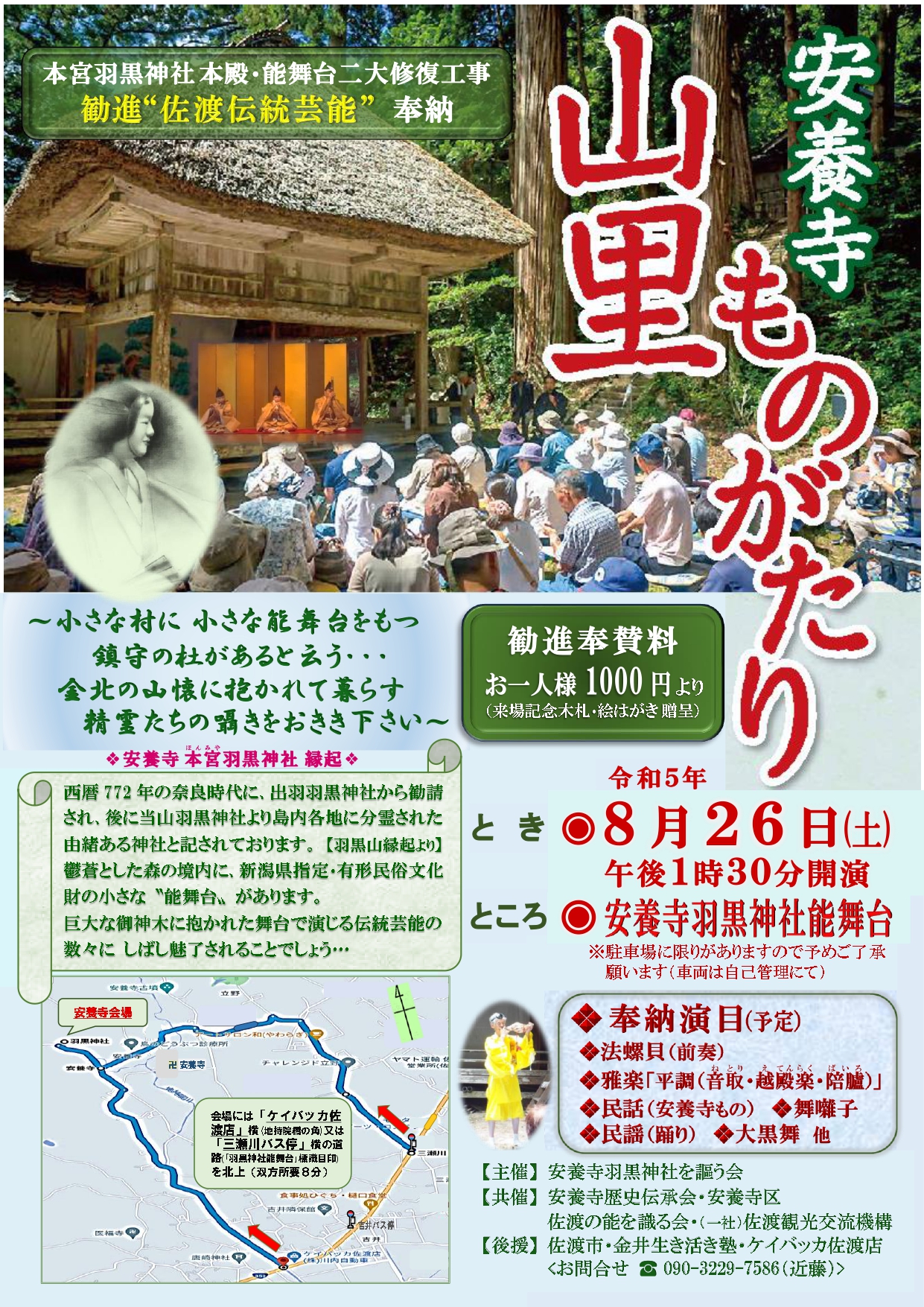 ~小さな村に小さな能舞台をもつ鎮守の社があると云う…金北山の山麓に抱かれて暮らす精霊たちの囁きをおきき下さい~詳細はチラシ画像をご覧下さい。●日時 8月26日(土) 13:30~●場所 安養寺 羽黒神社能舞台(新潟県佐渡市 安養寺 159)●勧進奉賛料 1,000円●主催 安養寺羽黒神社を謳う会
