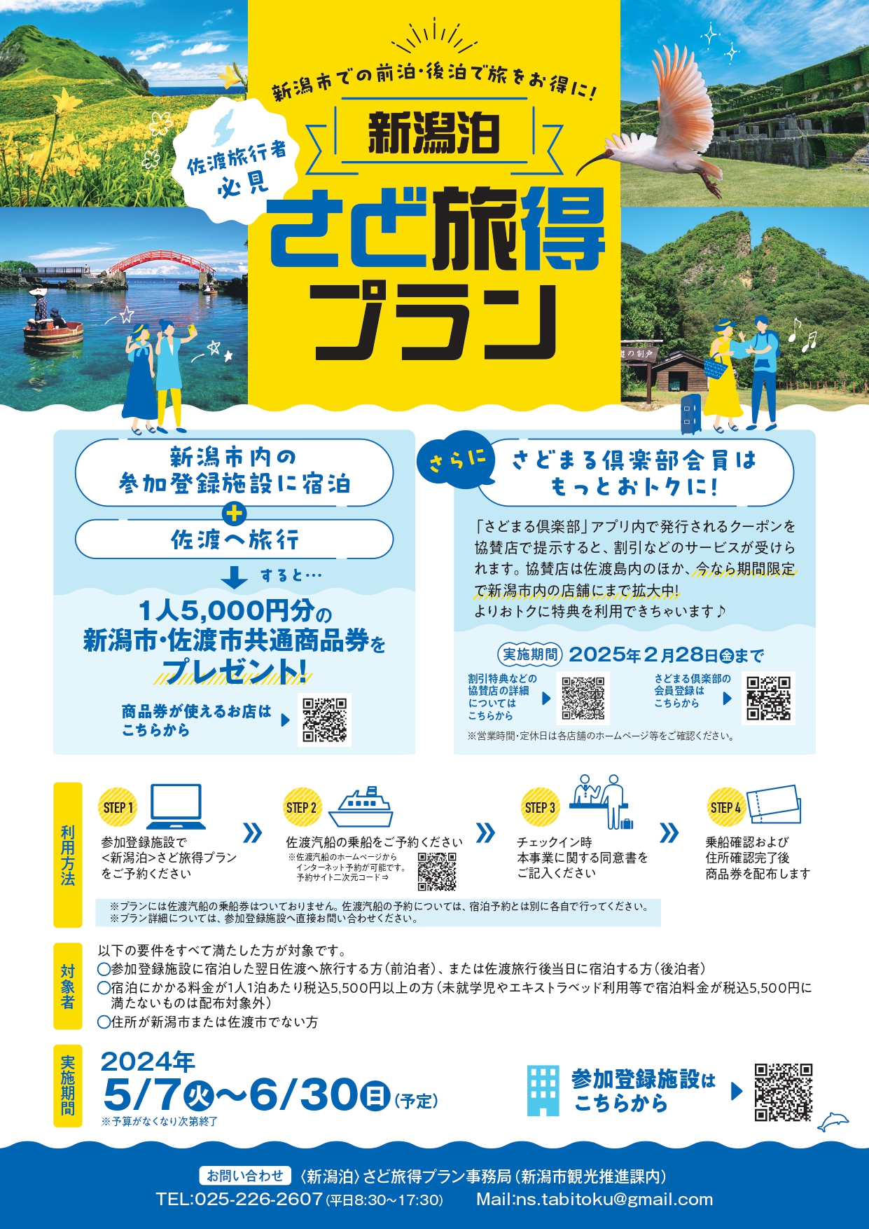 - 新潟市に前泊または後泊する方が対象!さど旅得プランが5/7から始まります