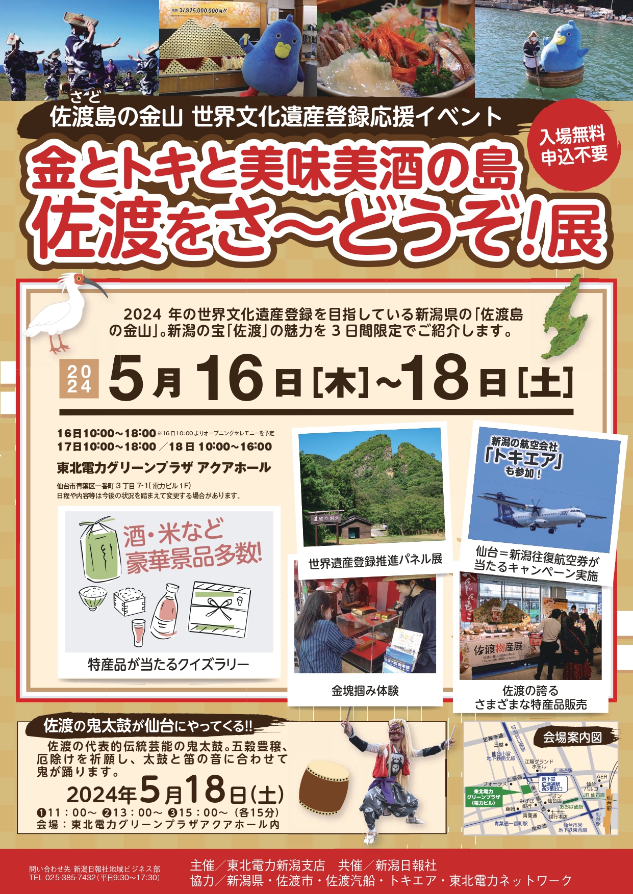 - 【仙台にて開催】金とトキと美味美酒の島 佐渡をさ~どうぞ!展が開催されます