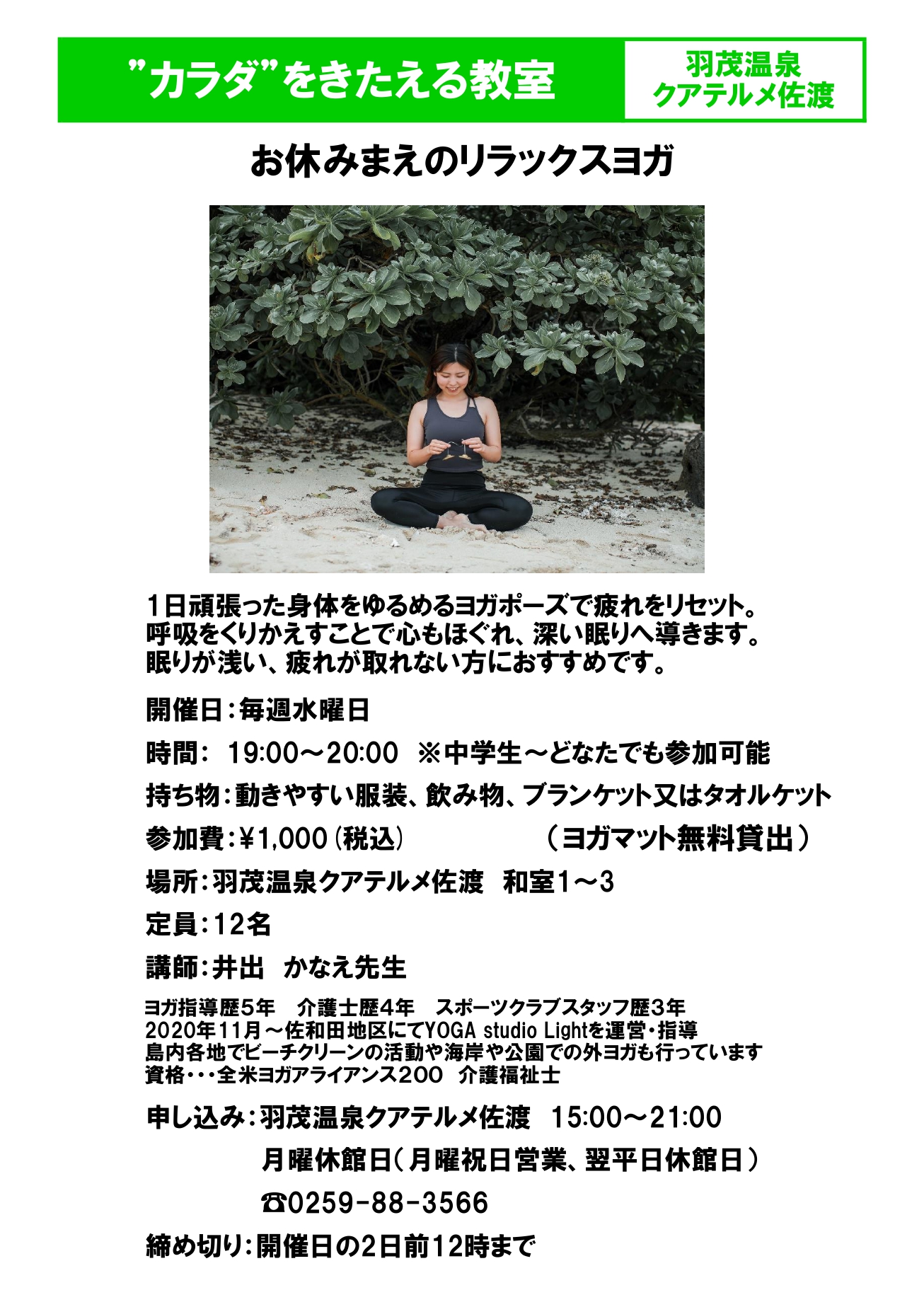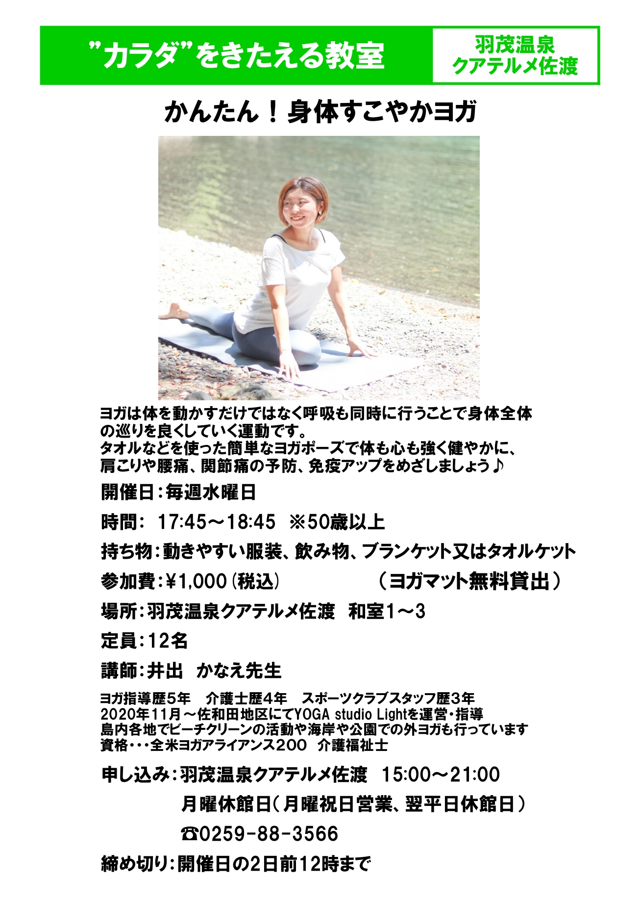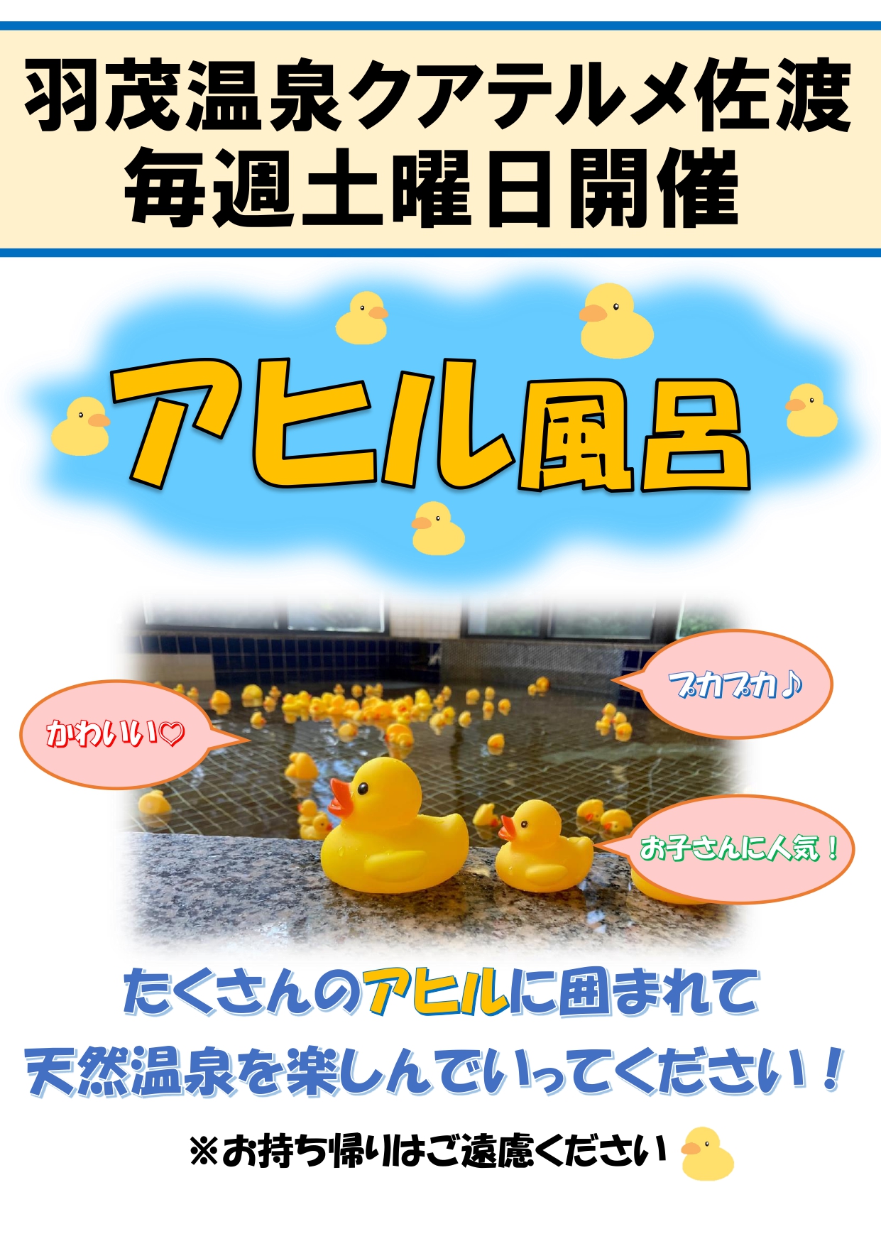 羽茂温泉では、定期的なイベントをたくさん開催しています。ヒノキ玉でリラックスしたり、アヒル風呂を楽しんだりしてみてはいかがでしょうか?ヨガイベントも開催しています。詳細はチラシをご覧ください。