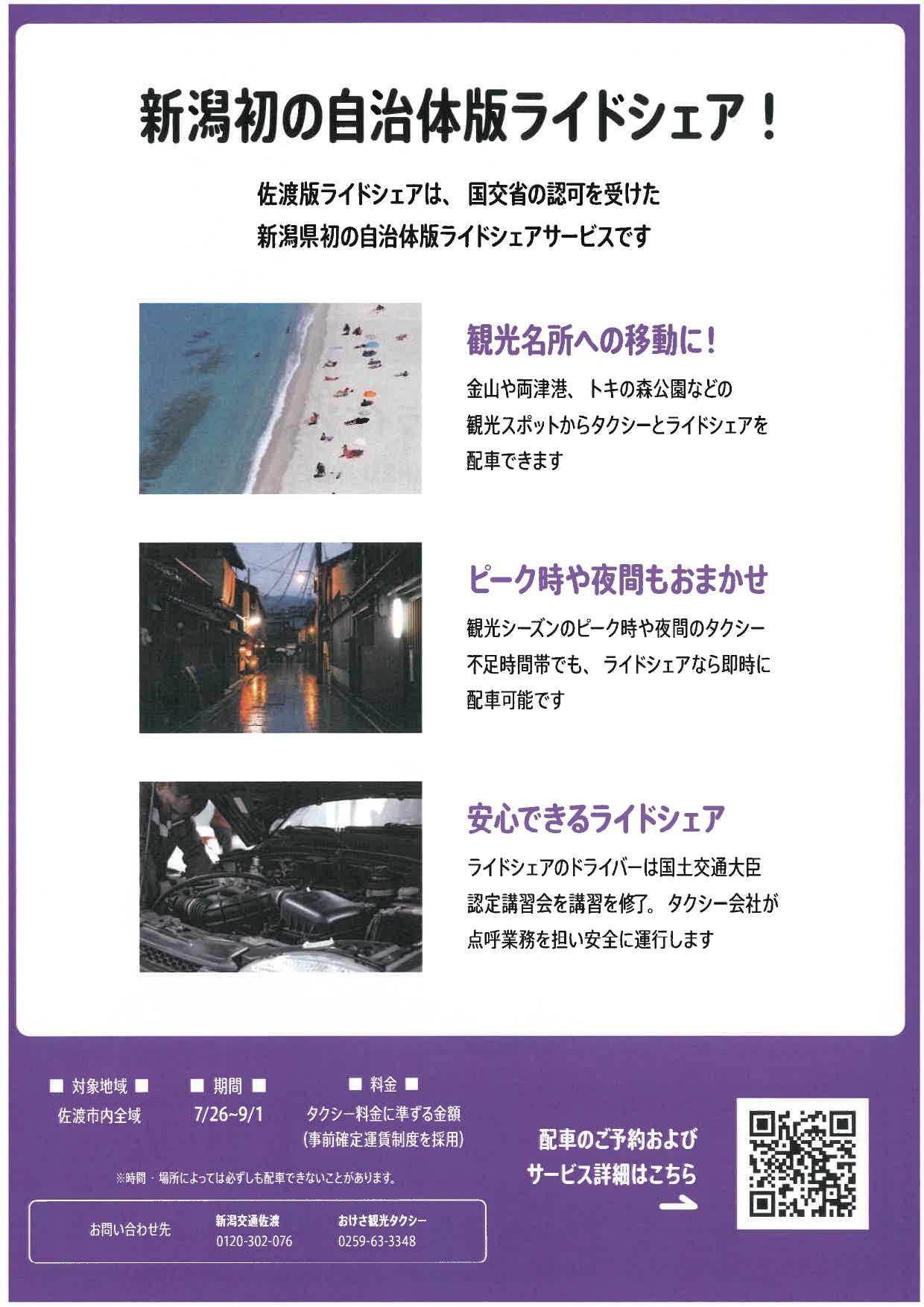 観光シーズンにタクシーが不足している地域において、市内のタクシー事業者と連携して、佐渡版ライドシェアの実証調査事業を下記の期間に行います。