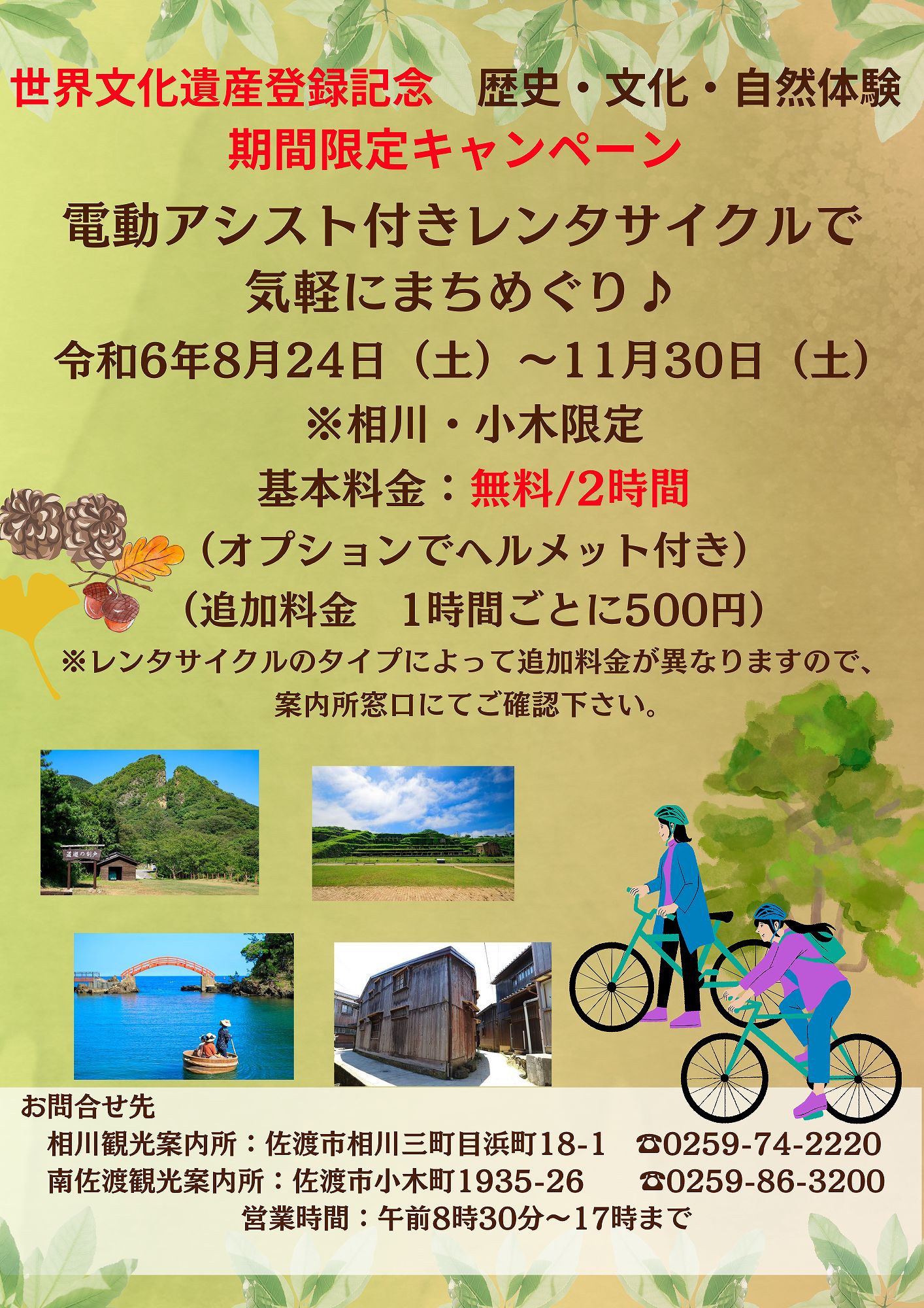 「佐渡島の金山」世界文化遺産登録記念として期間限定のレンタサイクルキャンペーンが始まります。