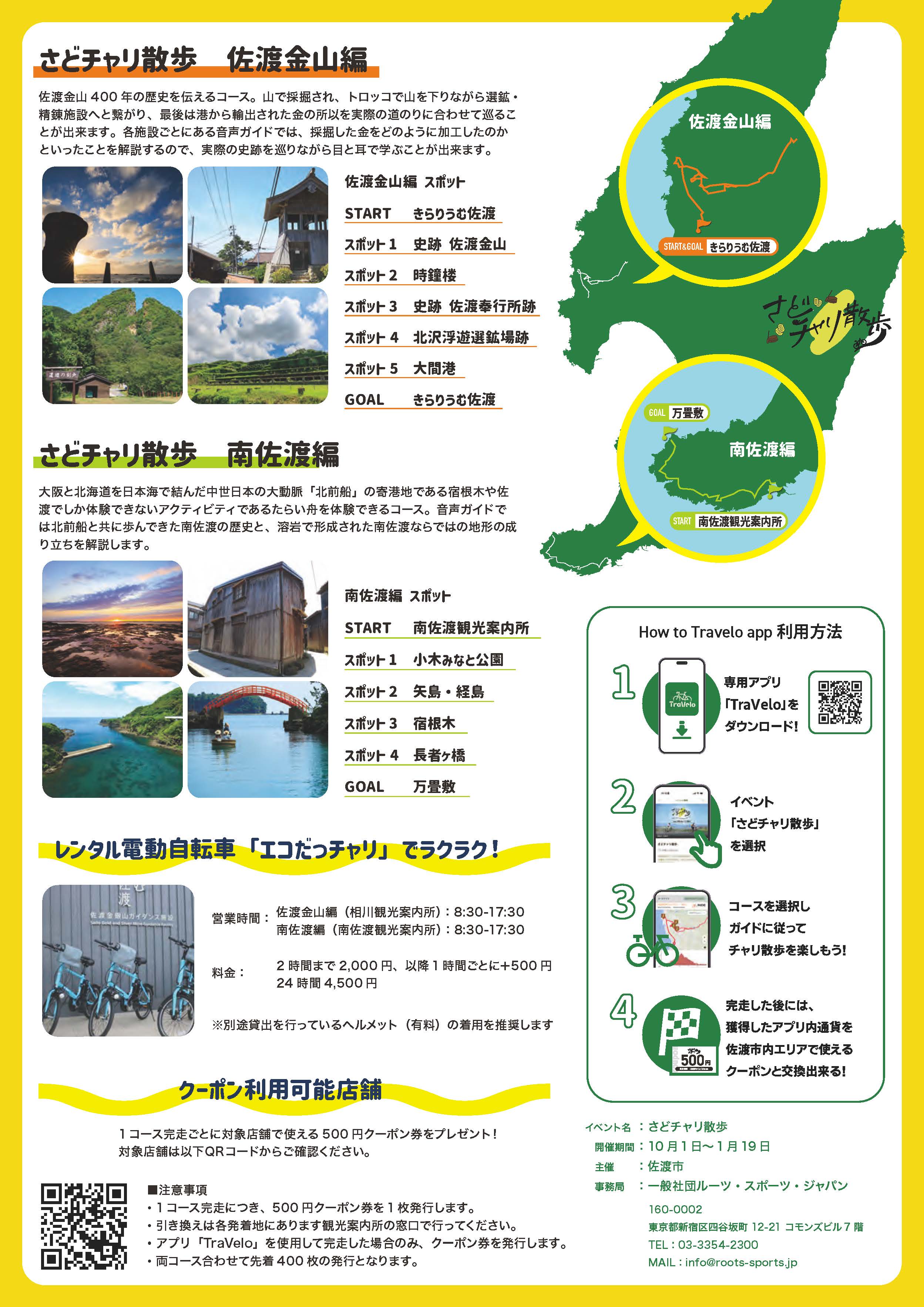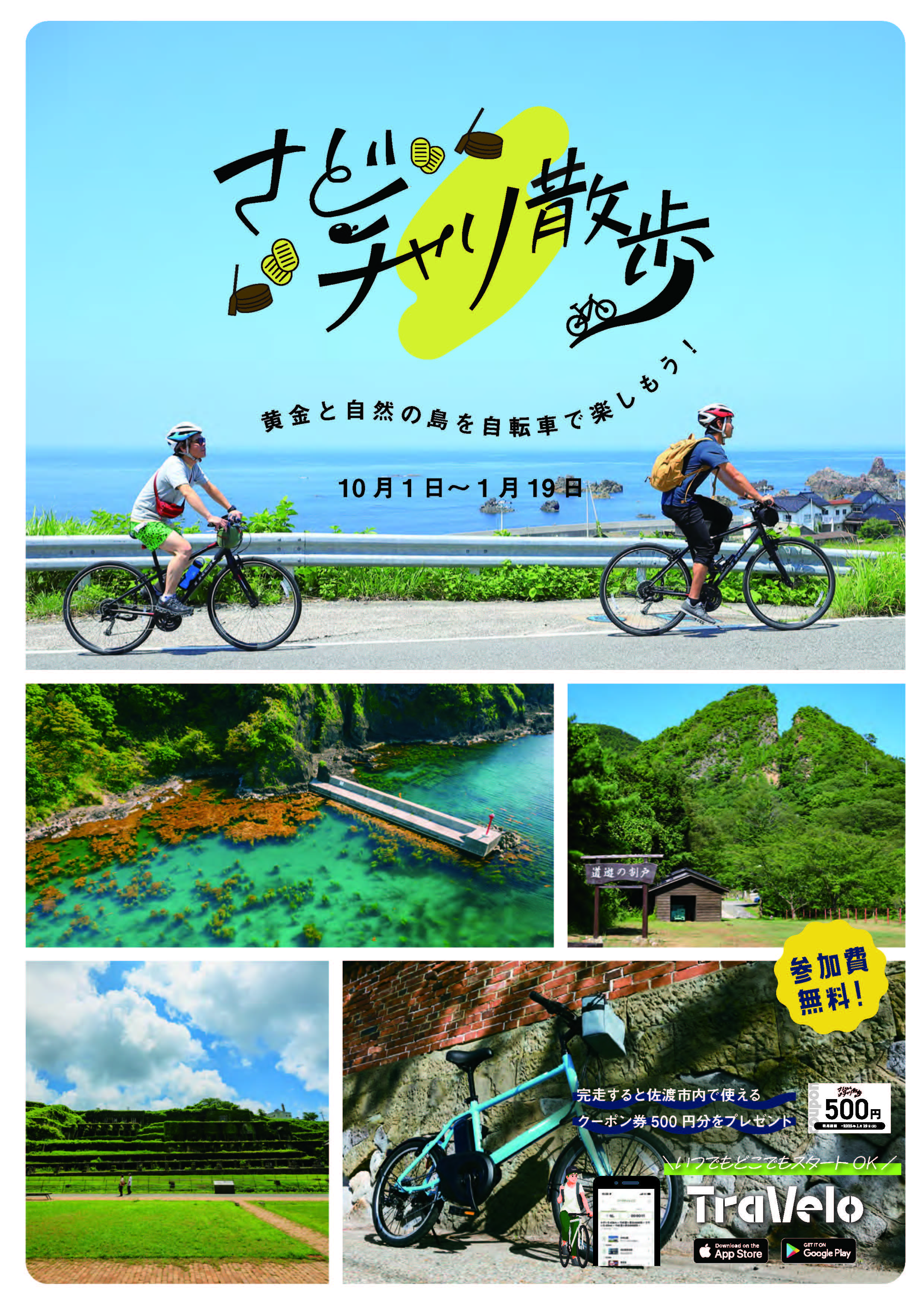 町巡りに便利な自転車アプリ「travelo(トラベロ)」を使ったキャンペーン「さどチャリ散歩」で、佐渡ならではのサイクリングコースを楽しみながら、島内で使える500円分のクーポンをゲットしよう!