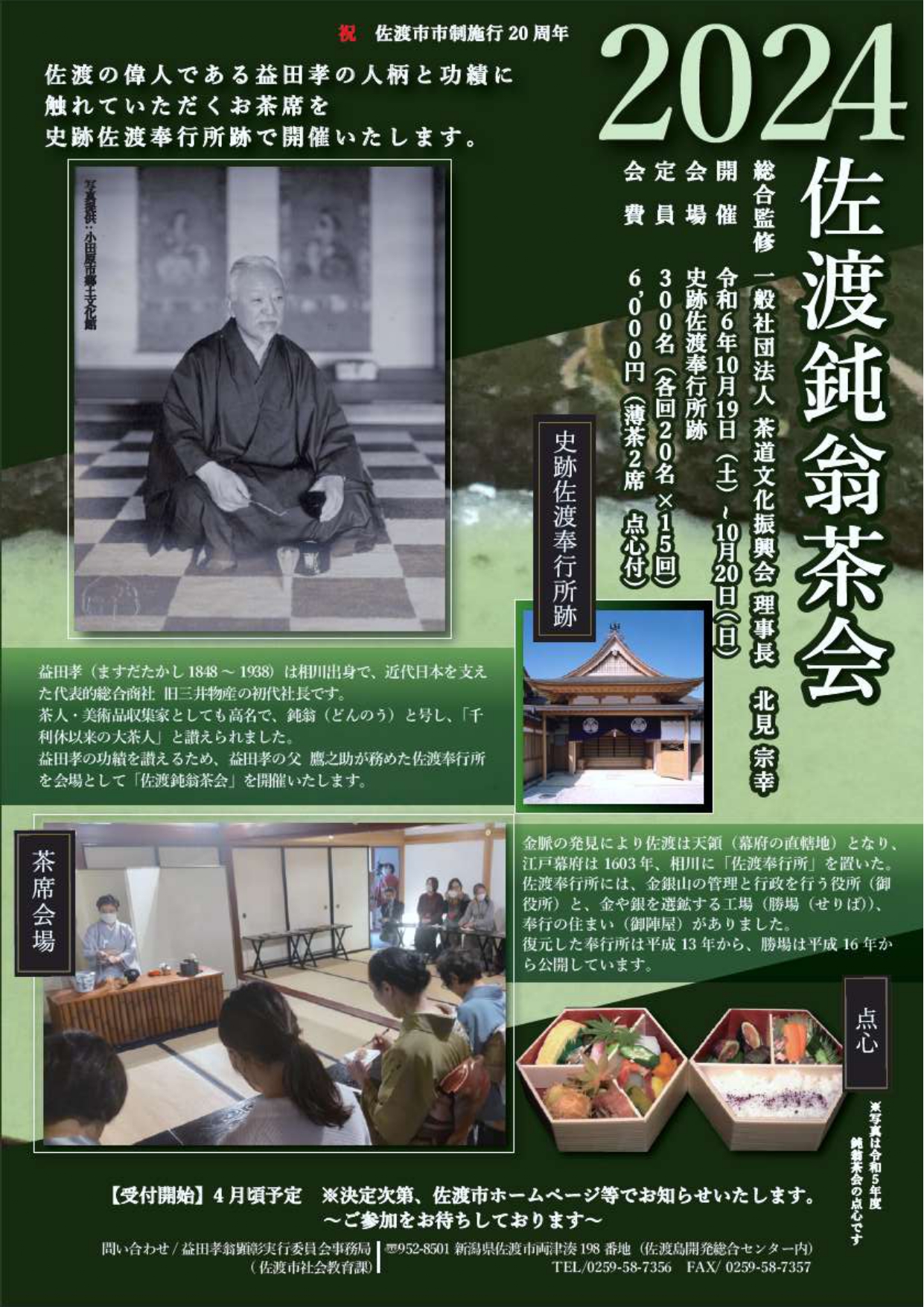 令和6年10月19日(土)・10月20日(日)の2日間に、佐渡奉行所において「佐渡鈍翁茶会2024」が開催されることに伴い、10月18日から10月21日までの佐渡奉行所の入館について、制限等が生じますのでお気を付けください。