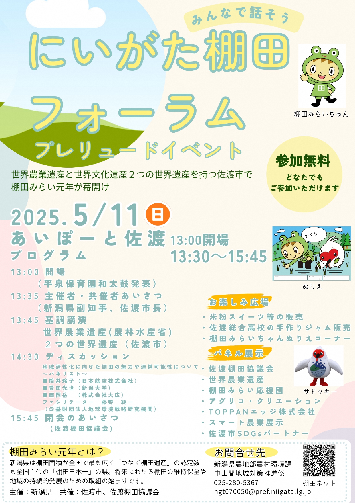 新潟県の「にいがた棚田みらい元年」プレリュードイベントとして、「にいがた棚田フォーラム」が開催されます!棚田に関する講演会のほか、米粉スイーツの販売、ぬり絵コーナーなど、お子様といっしょに楽しめるブース満載!皆さまのお越しをお待ちしています