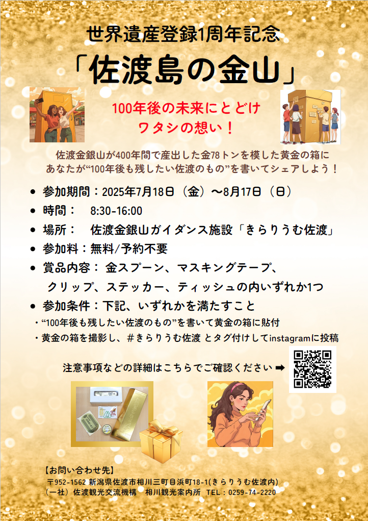 佐渡金銀山が400年間で産出した金78トンを模した黄金の箱に"100年後ものこしたい佐渡のもの"を書いてシェアしよう!
