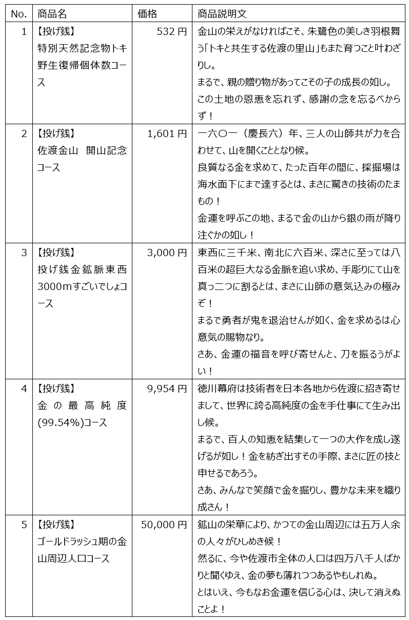 佐渡にちなんだ数字からなる5つの投げ銭メニュー