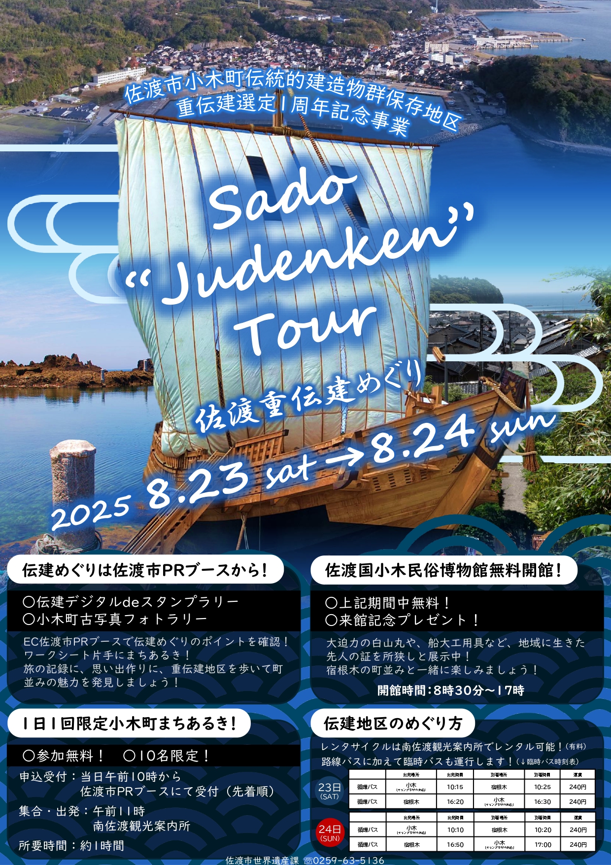 佐渡市需要伝統的建造物群保存地区(重伝建)選定から1周年。これを記念してアースセレブレーション期間中(8/23、8/24)重伝建の魅力を味わう「佐渡重伝建めぐり」を開催します!佐渡市には重伝建地区がなんと2カ所(宿根木・小木町)もございます。賑やかで歴史的な町並みの魅力に注目して佐渡の重伝建地区を楽しみつくしましょう!詳細はチラシをご覧ください!