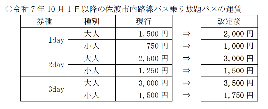 佐渡市内路線バス乗り放題パスの販売価格の改定について(2025年10月1日以降)